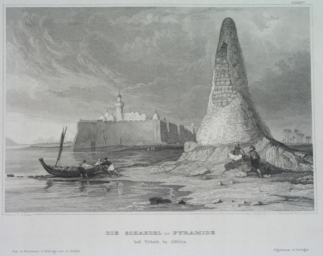 Оригинальная графика изображает SO -SALLED «Пирамида или башня черепа», в которой были проложены останки участников морской битвы и осада форта на острове Джирба в Тунисе. Мартими, согласно более ранней гравюре Томаса Алома, опубликованной в работе «Мейерана вселенная ...», Hildburghausen 1838. Очень хорошее состояние (обесцвечивание, грязь края и легкие складки). ------ Размеры изображения. В этом объекте европейцев сразу после публикации этой графики! «Lusatia» (как Artuz) на Allegro - интересные карты и графика на других аукционах
