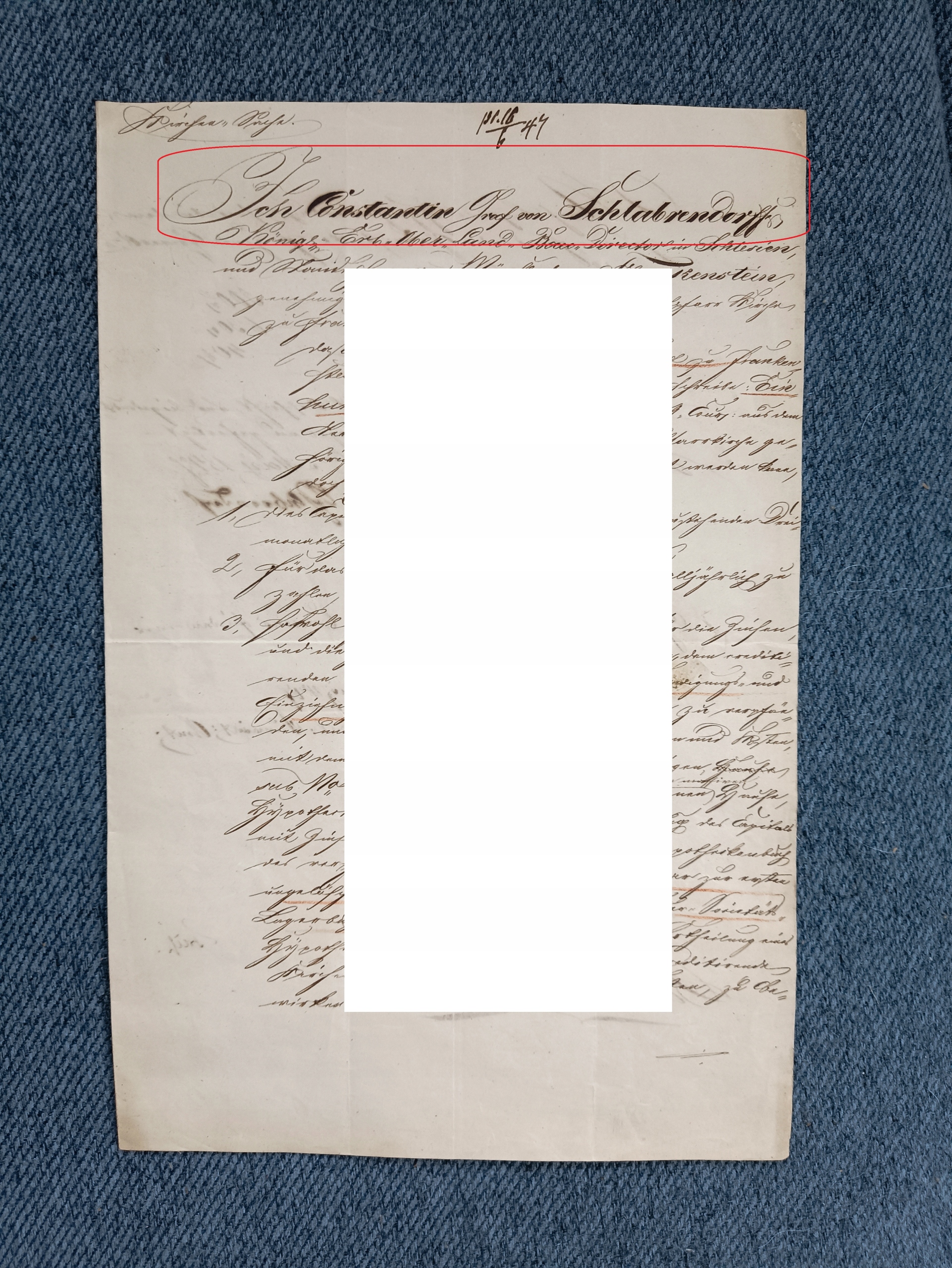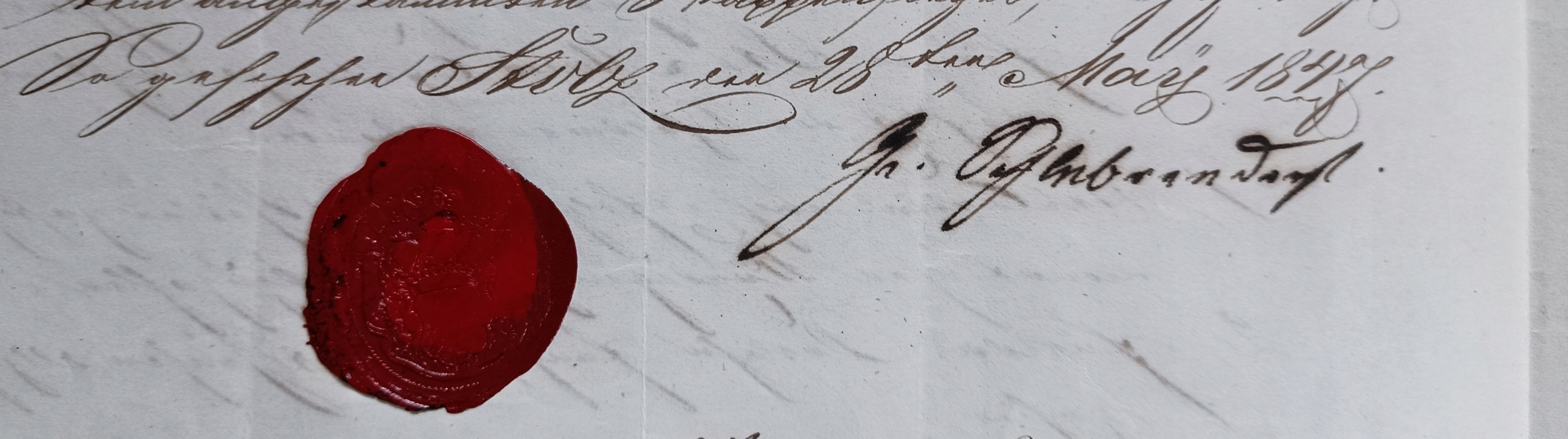 Письмо 28 мая 1847 В Stolz - Stolec возле Ząbkowice śląskie с печатью лака и рукописной подписью Count (Graph) Schlabrendorf. Incipit указывает, чье имени документ был выпущен и кто его подписал: их Константин Граф фон Шлабрендорф ... = I Konstaty Flab von Schlabrendorf ...