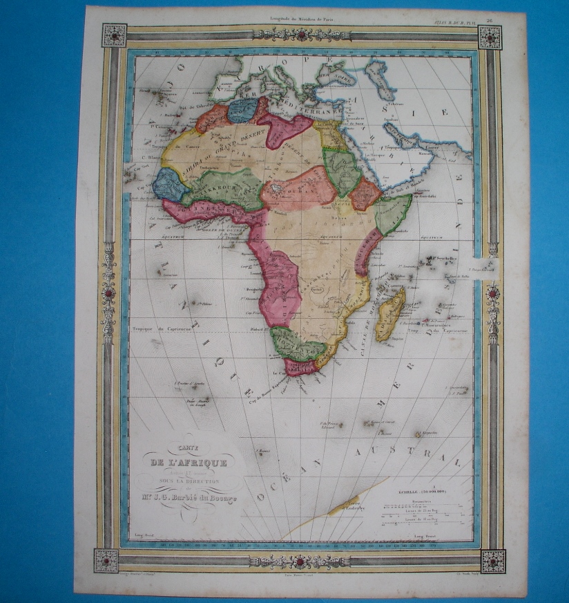 ОРИГИНАЛЬНАЯ КАРТА АФРИКИ, включенная в атлас Barbie du Bocage под названием «Geographie Universelle Atlas Illustre destine A L'Enseignement De La Geographie Elementaire…», опубликованная в Париже в 1848 году. Это гравюра на стали, раскрашенная вручную линейно и поверхностно, напечатанная на довольно плотной бумаге без печати на оборотной стороне. . Размер карты с декоративной рамкой примерно 22,5 на 30,5 см, карточки примерно 25,5 на 33,5 см. ------ Состояние очень хорошее (грязь и обесцвечивание бумаги).