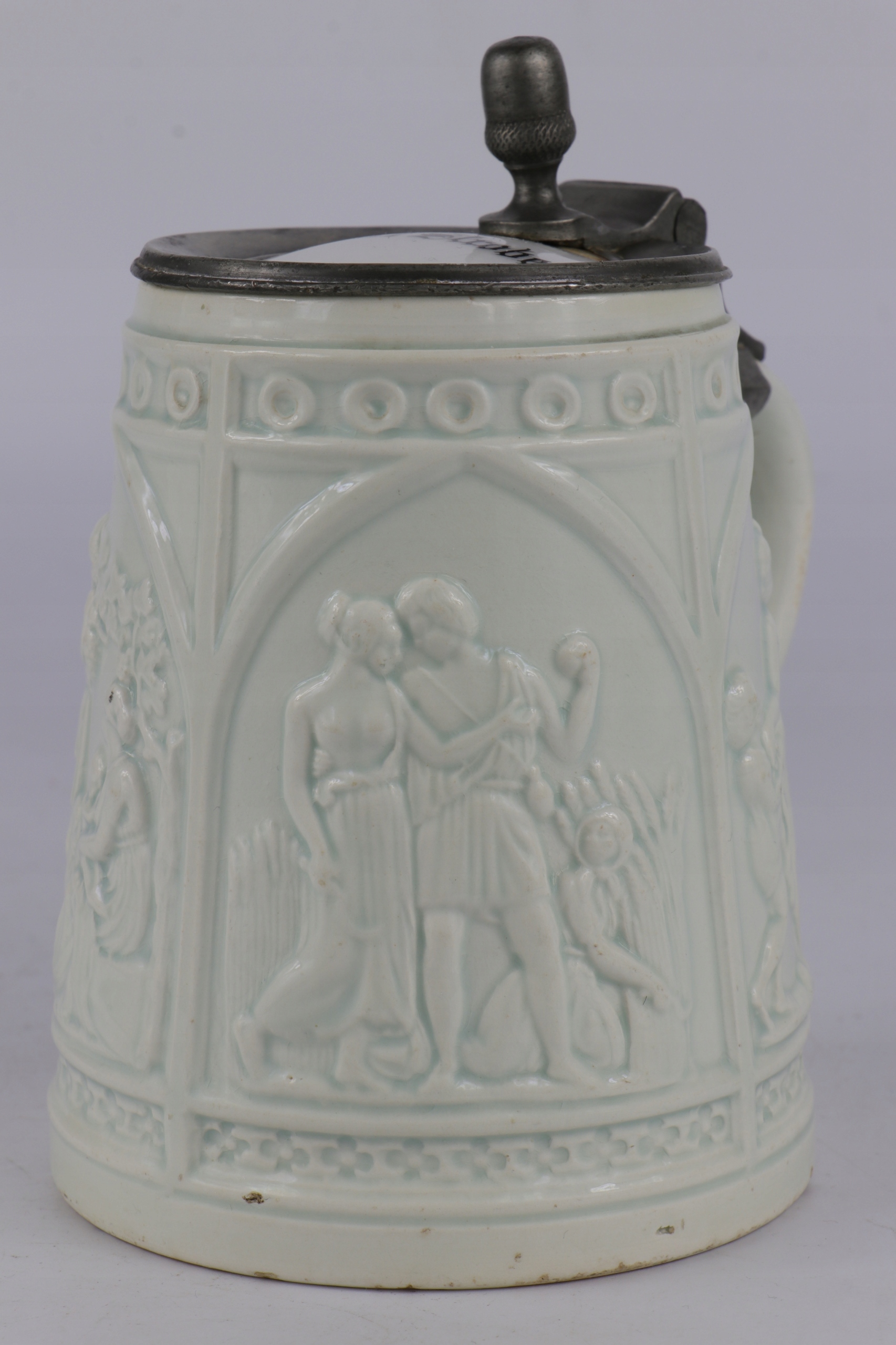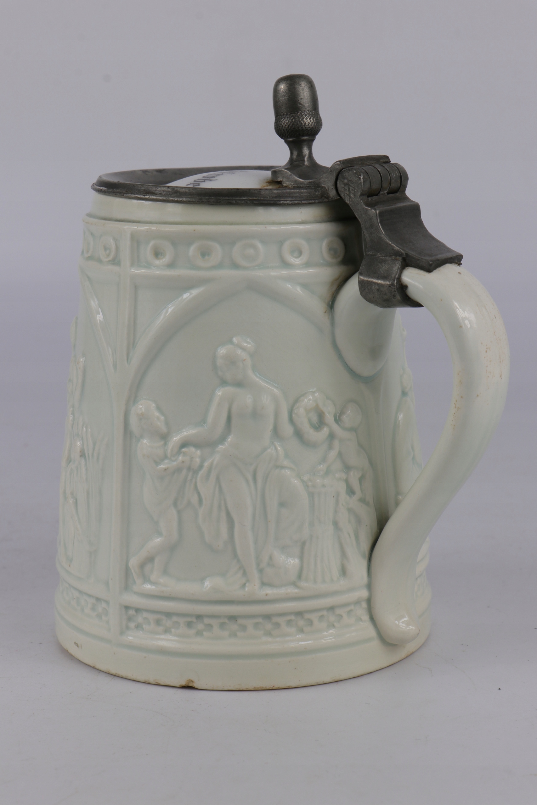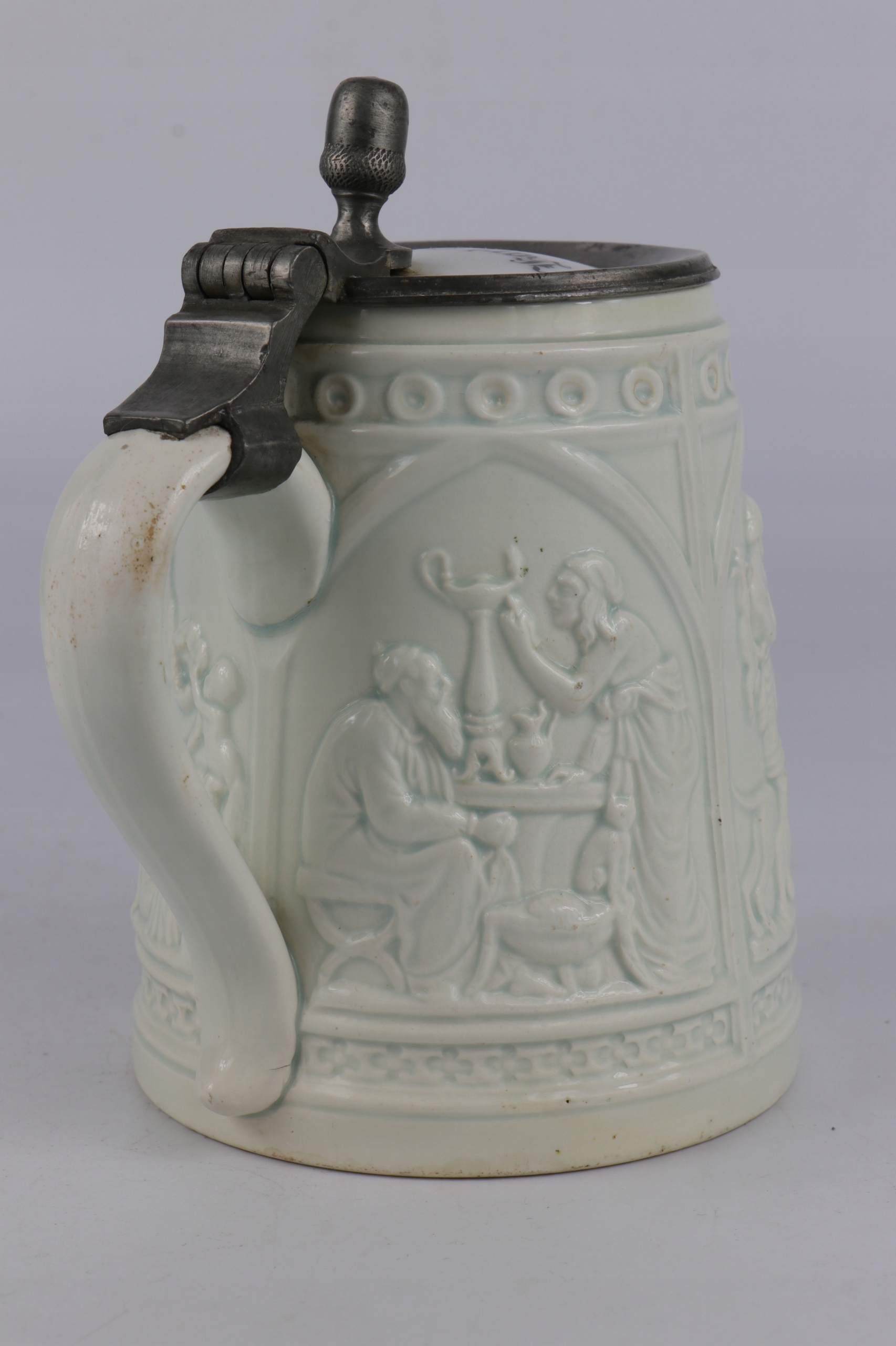Очень старая историческая кружка из легкой керамики. Возрастная кружка с фарфоровой табличкой с именем владельца. Легкая керамика с облегчением орнамента древних сцен. Кружка коллекционера.