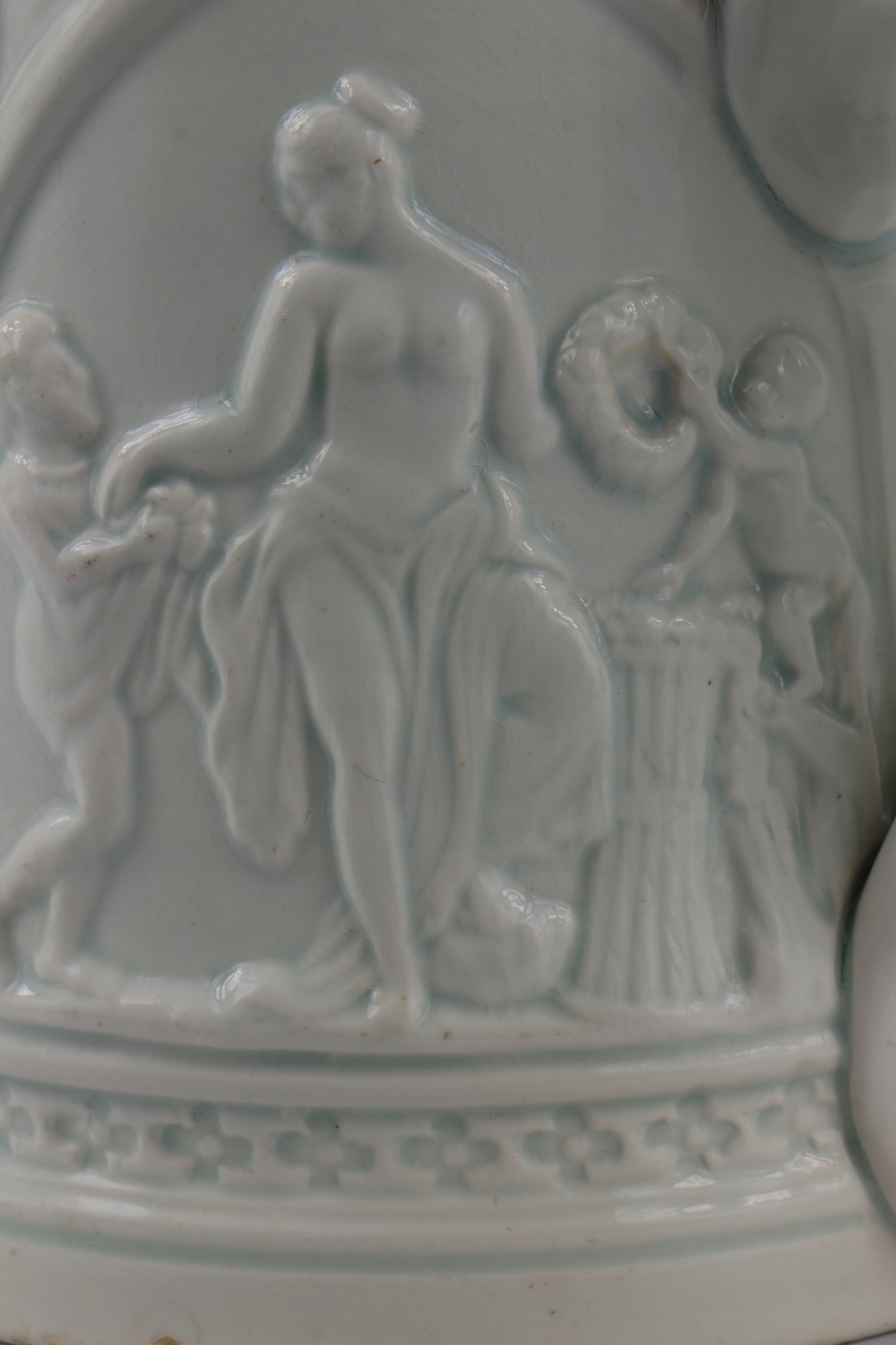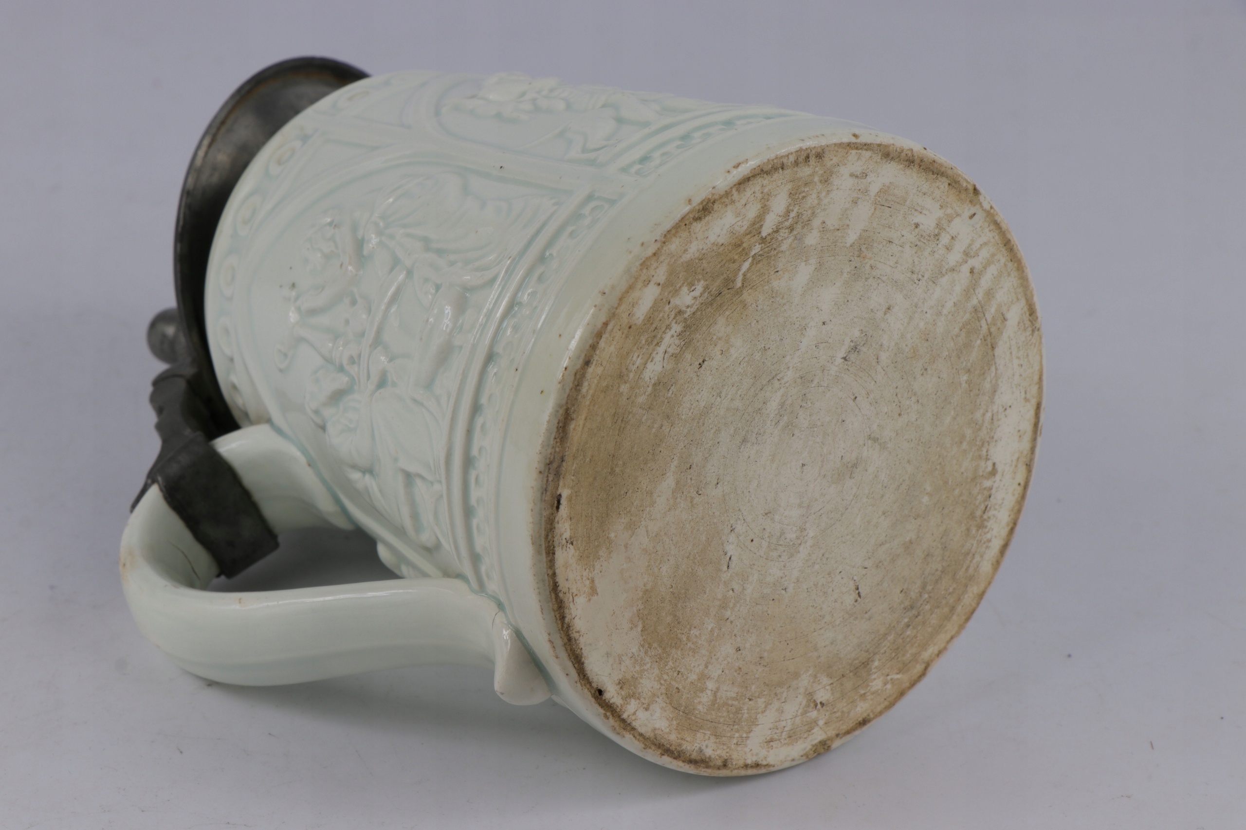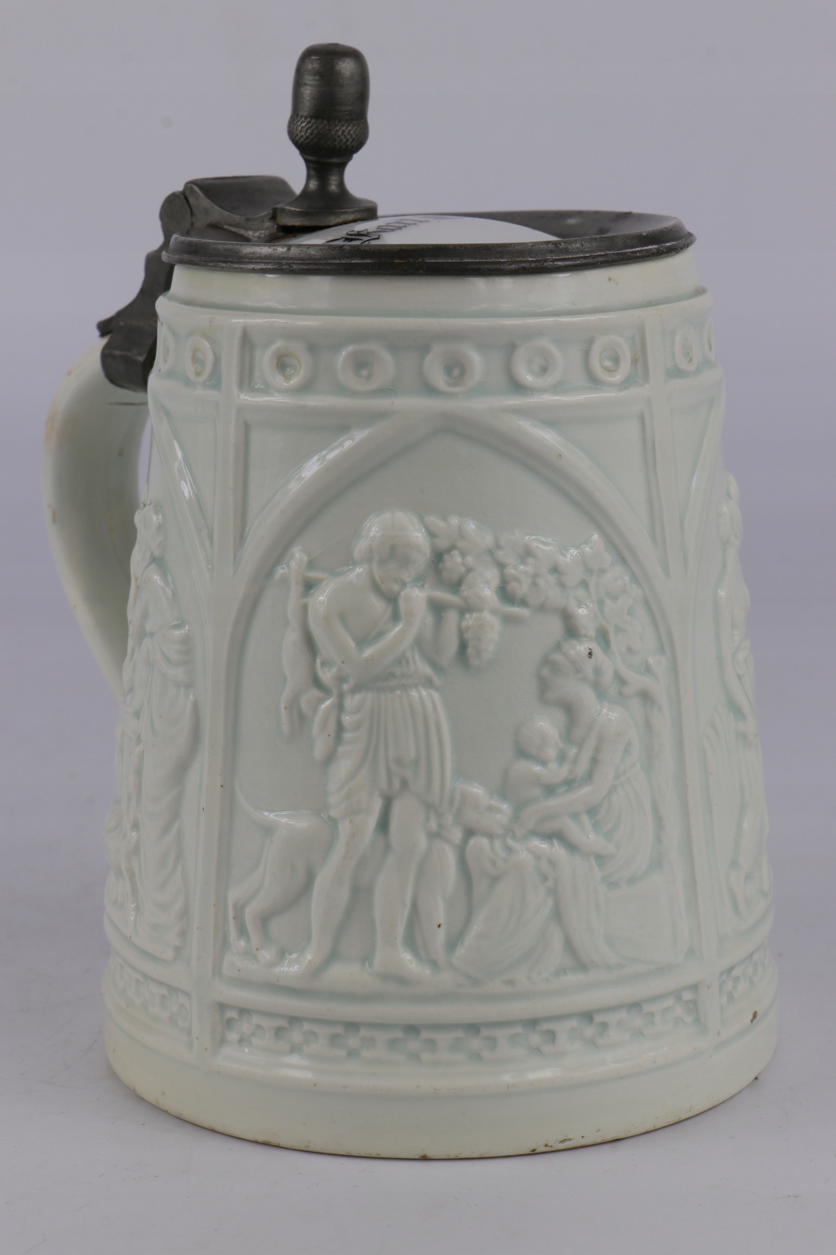 Очень старая историческая кружка из легкой керамики. Возрастная кружка с фарфоровой табличкой с именем владельца. Легкая керамика с облегчением орнамента древних сцен. Кружка коллекционера.