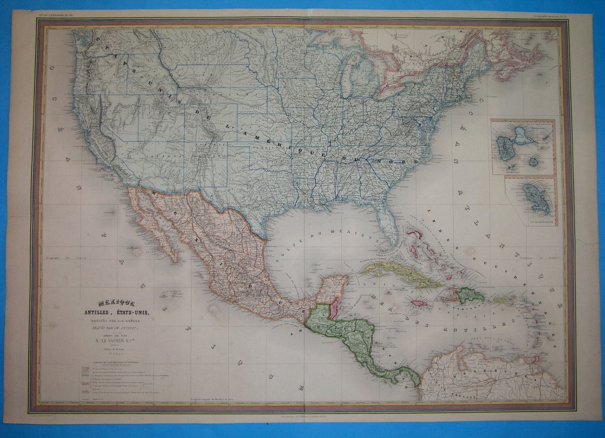 ОРИГИНАЛЬНАЯ, ОГРОМНАЯ КАРТА США, Мексики и Центральной Америки, выполненная А. Х. Дюфуром, гравированная Ч. Дионне, опубликованная в «Всемирном атласе, телосложении, истории и политике...», изданном издательствами «Librairie Abel Pilon» и «A. Levasseur & Cie», Париж, 1860 г. Это гравюра на стали, раскрашенная вручную линейно и поверхностно, снабженная картушем с названием карты и кратким описанием используемых сокращений. Печать четкая на довольно плотной бумаге, лист сложен атласом, оборотная сторона без печати. ---------Размеры карты с рамкой примерно 75 на 54,5 см, а листа примерно 82 на 57 см ------- Состояние: карта проклеена в нескольких местах, без повреждений изображения, загрязнений, заломов и незначительного обесцвечивания бумаги. ---