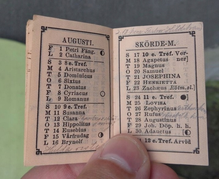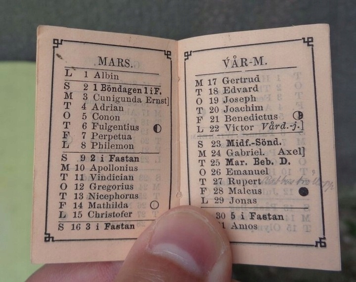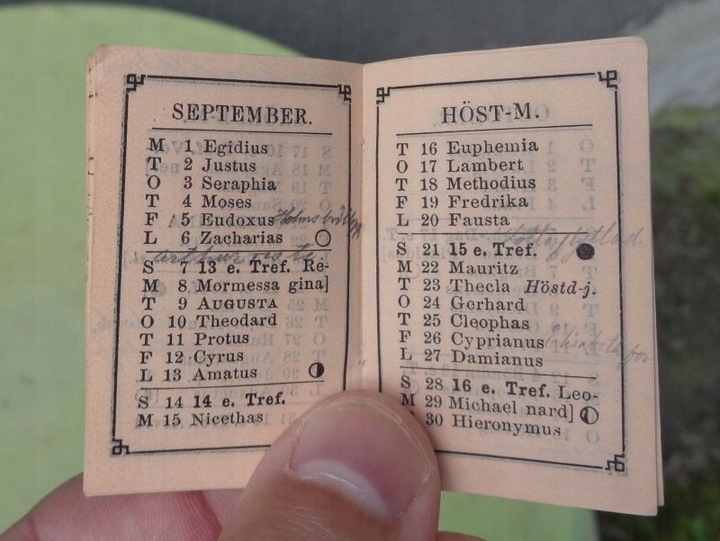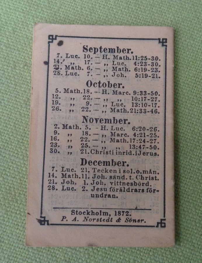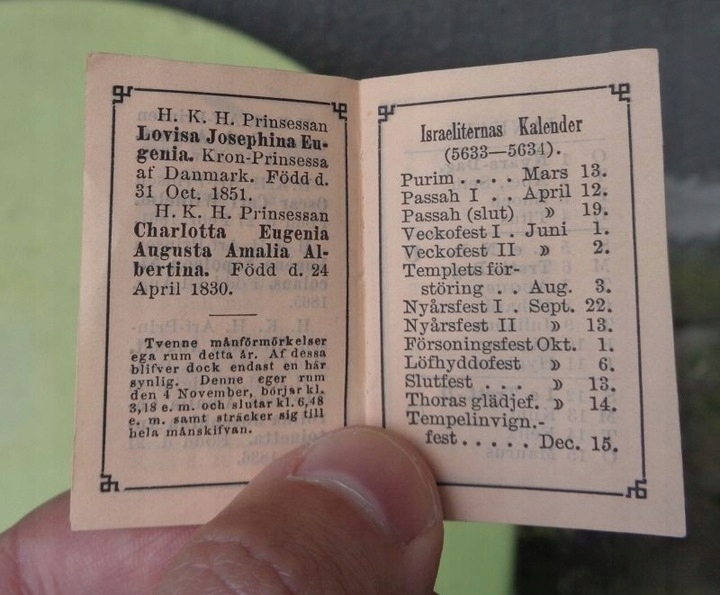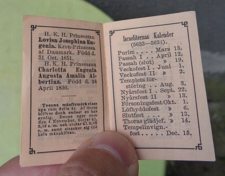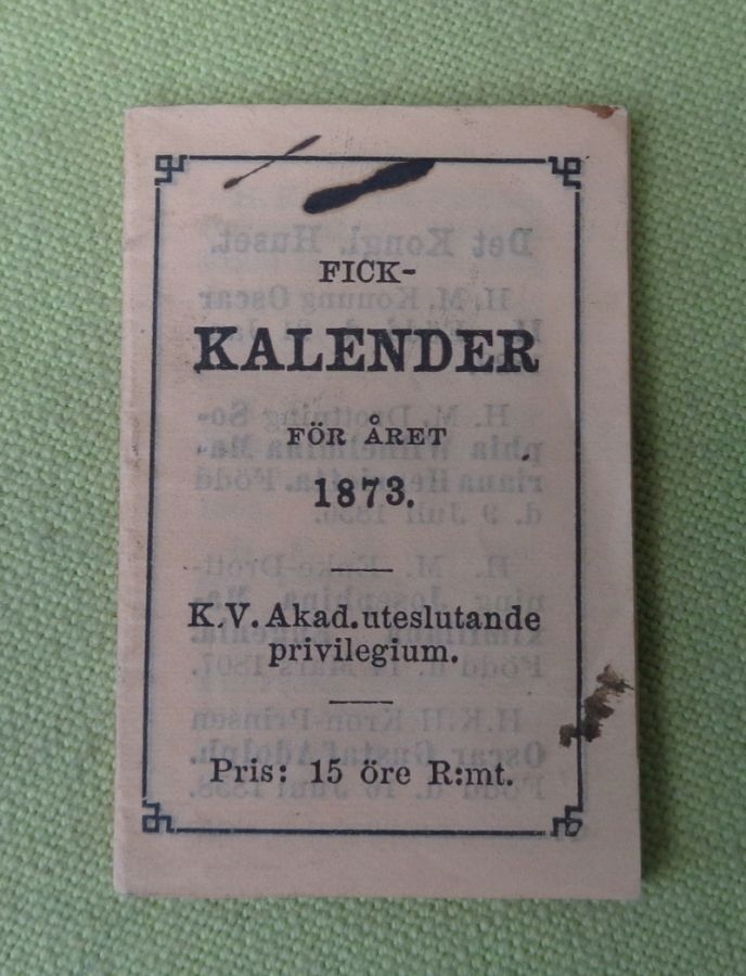 интересный, интересный шведский карманный календарь с 1873 года. На выставке есть богато украшенный титульный лист. На титульном листе есть интересная граница. Календарь имеет дополнительные заметки. Выставка имеет карты как в течение нескольких месяцев, так и с дополнительным описанием. Выставка завершена. Я рекомендую для коллекционеров и не только.