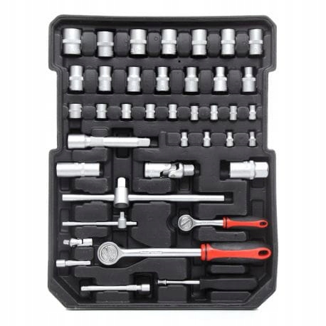 В комплект входят: рожковые ключи, торцевые ключи, трещотка, молоток, набор плоскогубцев, уровень, струбцины, рулетка, изоляционная лента, нож, набор гвоздей и шурупов, а также а также отвертки и биты для бит.