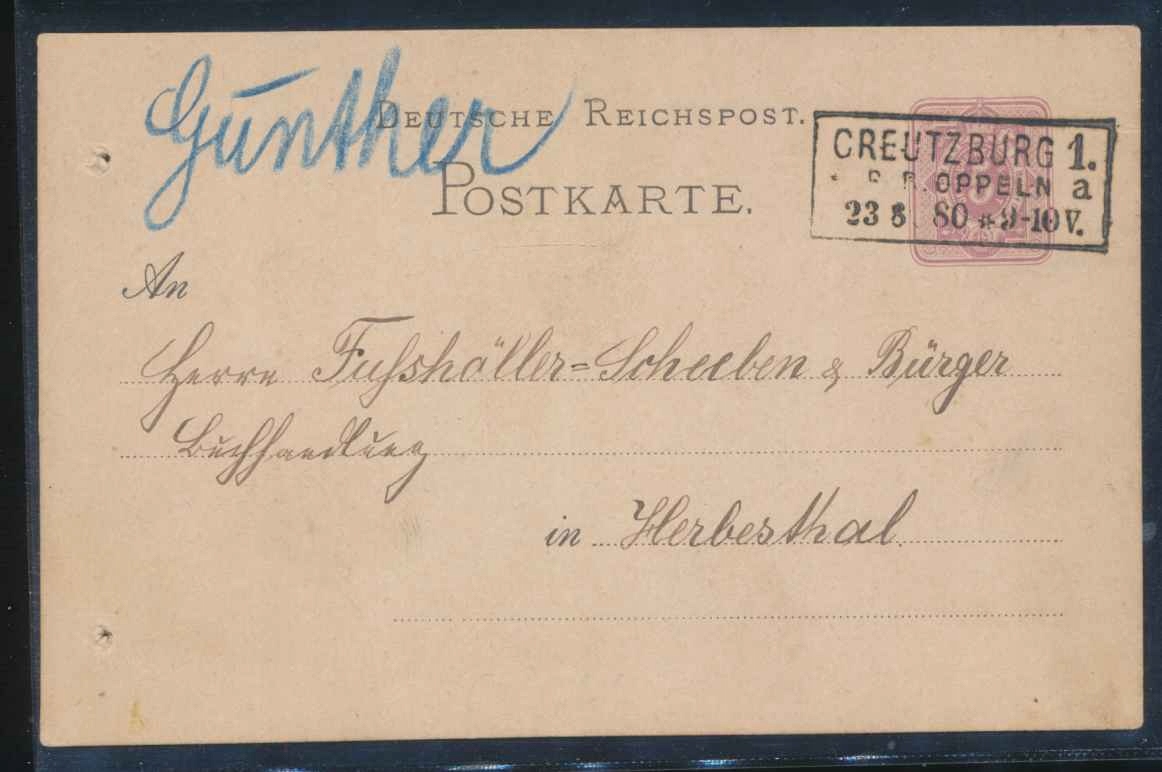 1880 г. ПРУЗИЯ, СИЛЕЗСКАЯ ПРОВИНЦИЯ, карточка КРЕЙЦБУРГ 1 Р.Б.ОППЕЛЬН/КЛУЧБОРК.