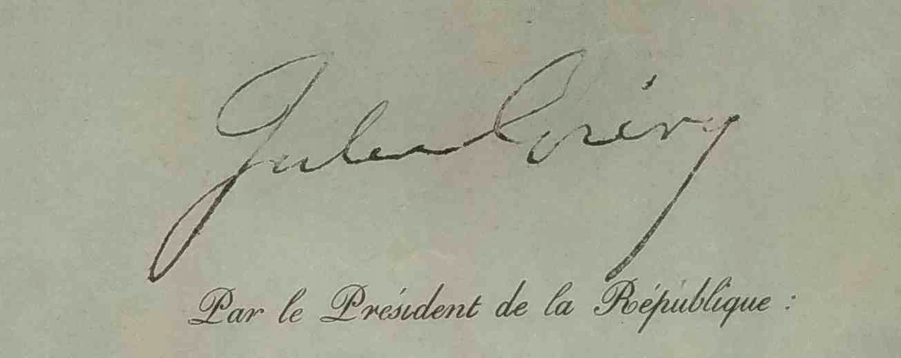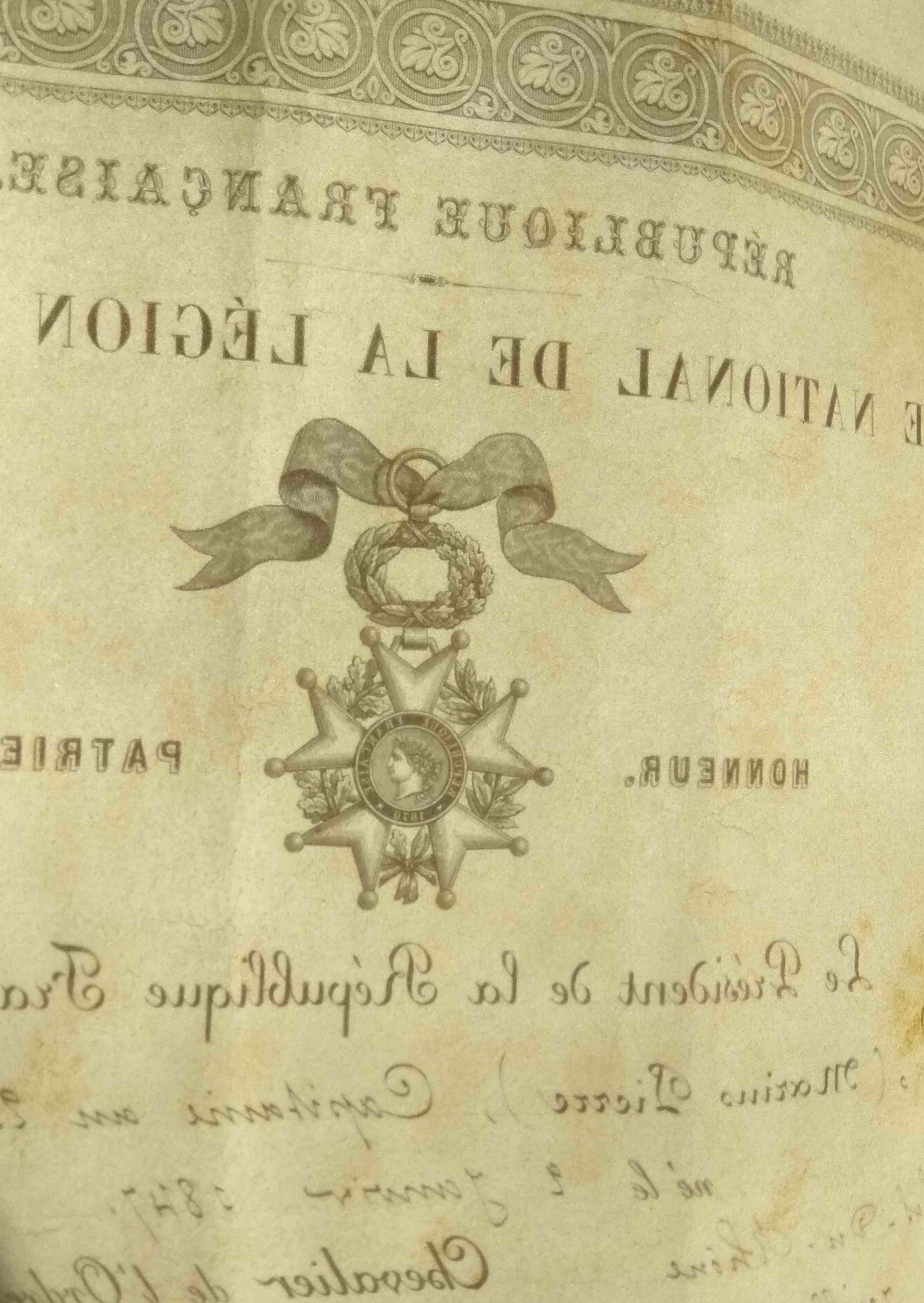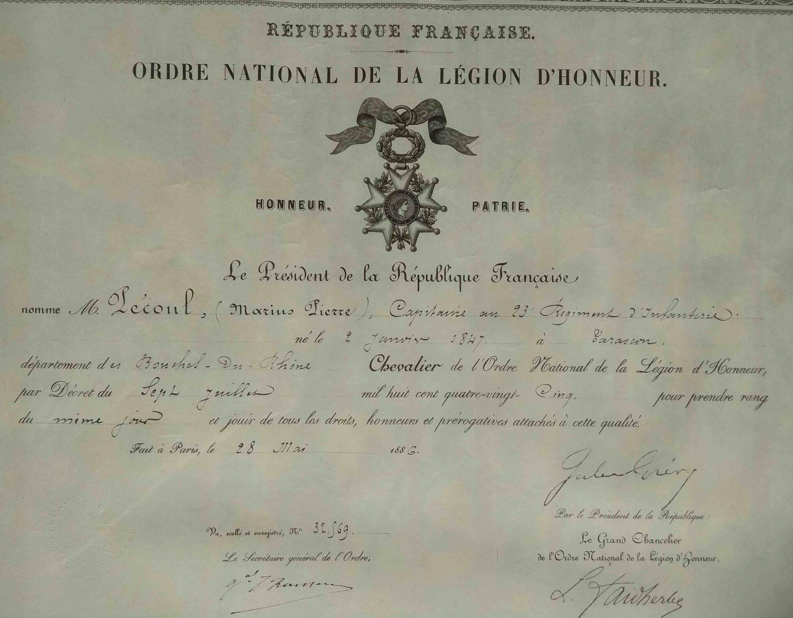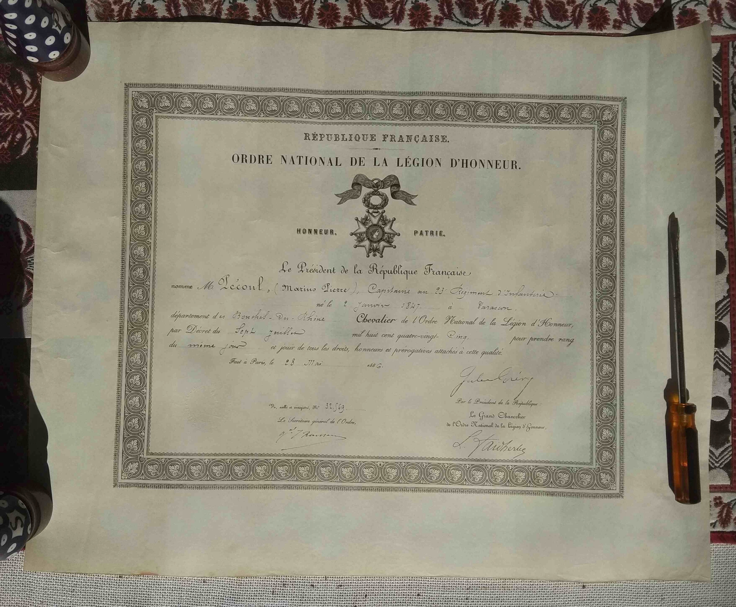 Дополнительные фотографии могут быть отправлены P> Национальный орден Лейи чести (гражданский. Орден Ордена (в документе) - Honneur et Patrie (французская федеральная честь и родина). В порядке пожилых людей французских наград Ордена Легиона Почетного, он в первую очередь, до Ордена Освобождения. , первое консул Французской Республики, позже император Наполеон I, 19 мая 1802 года. Первая церемония украшения состоялась 15 июля 1804 года, когда получил приказ, среди прочего. Польский генерал Ян Генрик д -брауски . Legion of Honor был первой наградой христианских стран, чей знак не имел формы креста, а звезды. Республика В нашем случае тогдашняя рукописная подпись на документе была сделана тогдашним президентом Жюлем Греви. 1887, Co -Colonel of Andorora, адвокат, республиканец. Титульный. Во время своего президентства французское правительство проводило агрессивную колониальную политику в Северной Африке и Юго -Восточной Азии. Он является автором Discours Politiques et Judiciaires (1888). B> - капитан 23 Полк -пехота. Из французских источников мы знаем, что президент Франции наградил капитана Мариуса Пьера Пекула почетную медаль за 17 лет верного служения и участия в 3 военных кампаниях (Bulletin des Lois de La République Française, том 31, Paris 1886, p. 192) Полем К сожалению, мы не знаем, какие кампании примерно, возможно, (1869-1886) он был награжден приказом участия в «Потерянной французской войне» 1870-1871; Помощь покинула сентябрьую революцию в Париже в 1870 году и ликвидацию восстания, называемого Парижской коммуной в 1871 году (также возможно участвовать в колониальных кампаниях в Африке или Азии). Сталорит?) Печать заполнено вручную. В левый год (в кадре) происходит плохо видимое впечатление о печати офиса ордена. Рукопись свернута. Очень хорошее состояние. ------------------------------