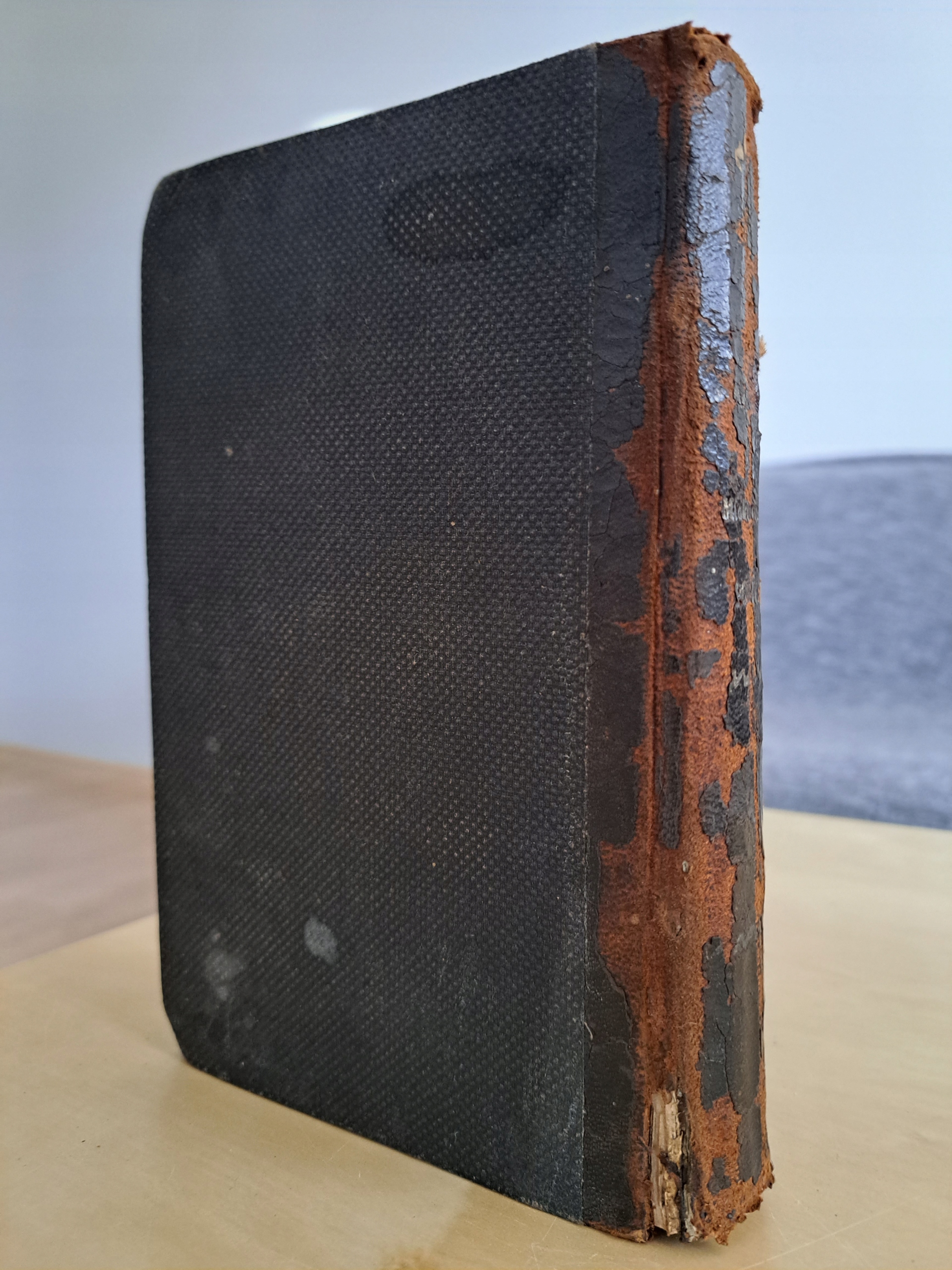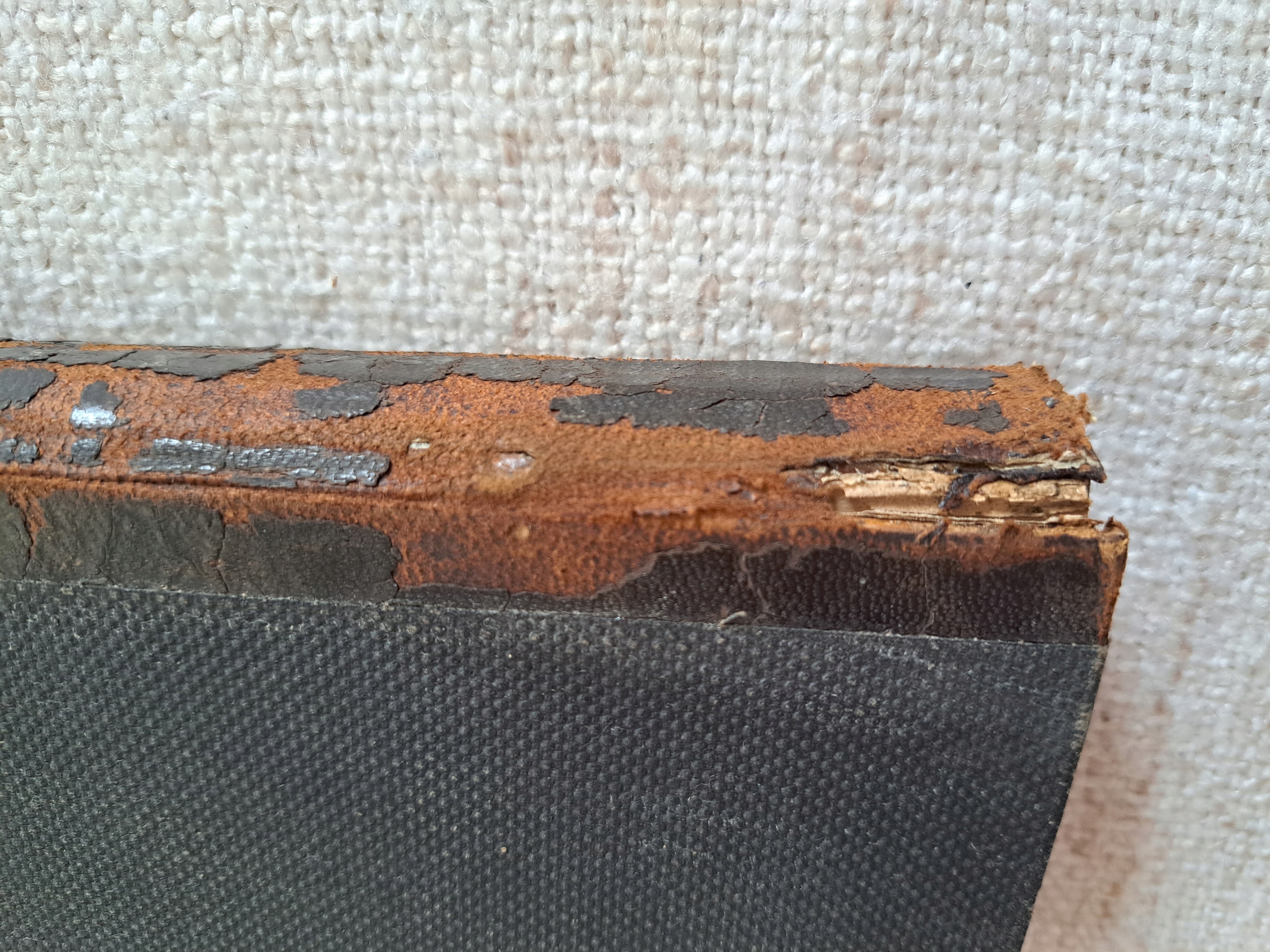 Состояние: хорошее. Единый книжный блок. Страницы обесцвечены с возрастом. Отсутствует фрагмент предтитульного листа. Дырка на корешке книги. Корешок внизу переплета порван.