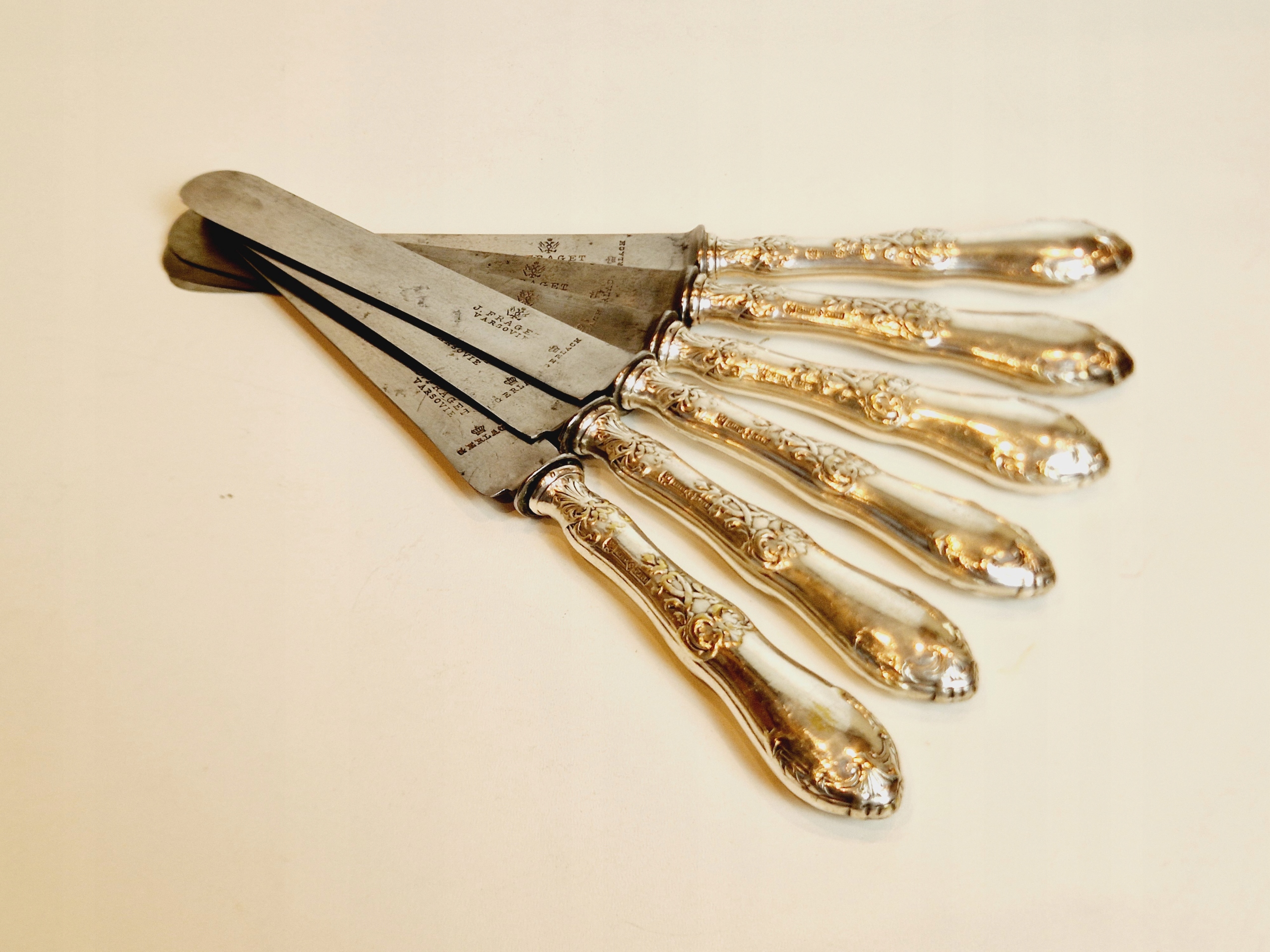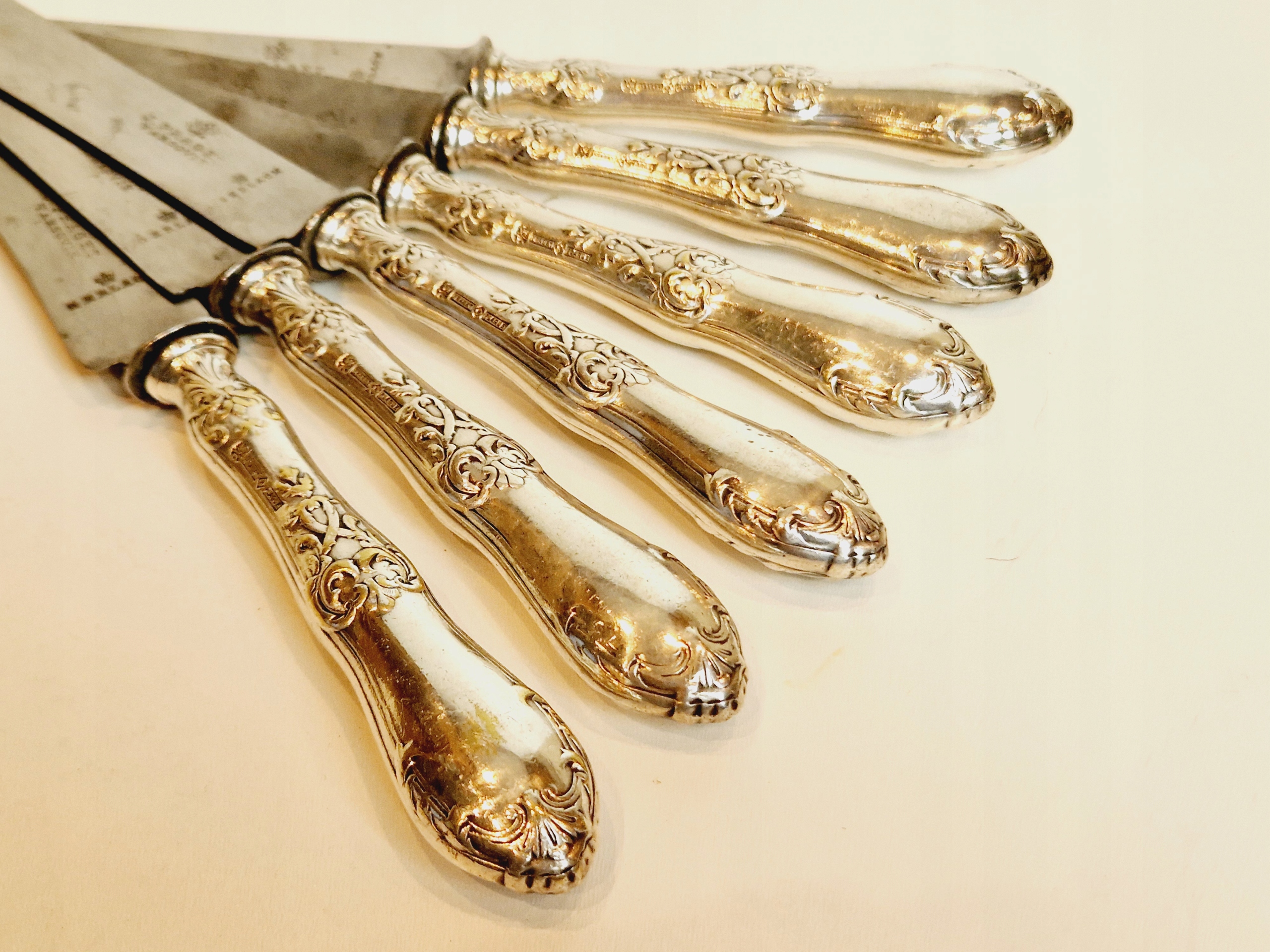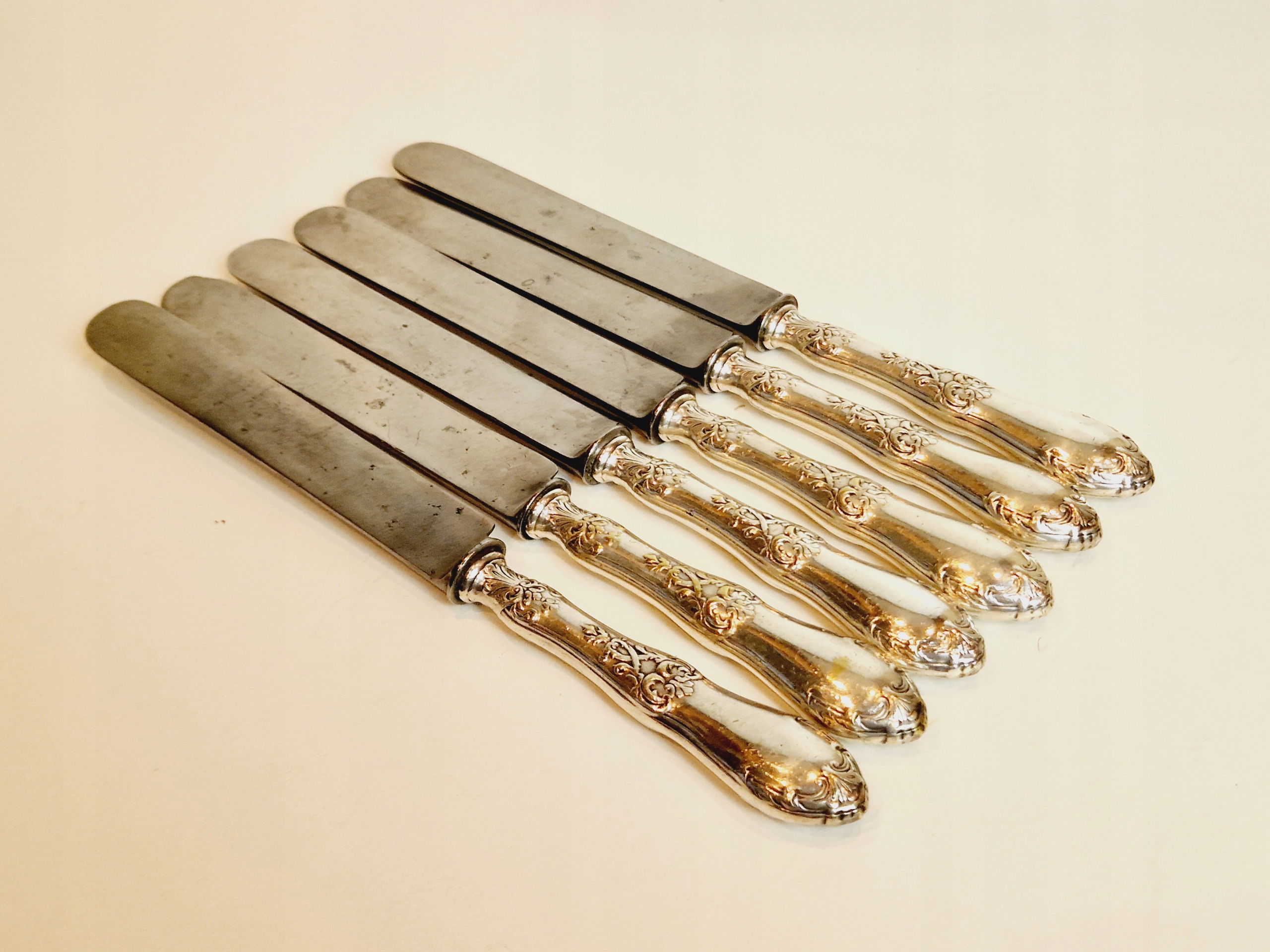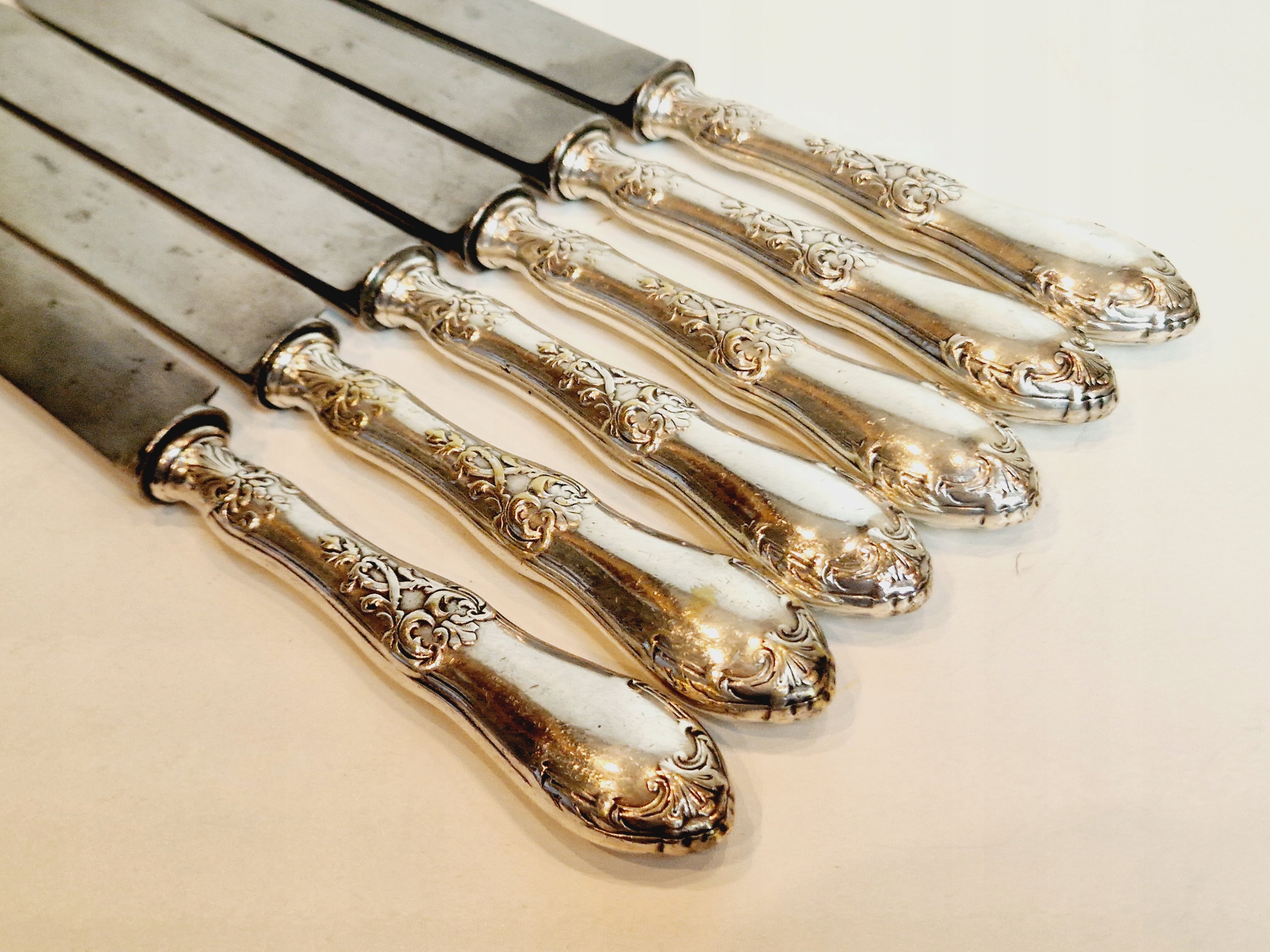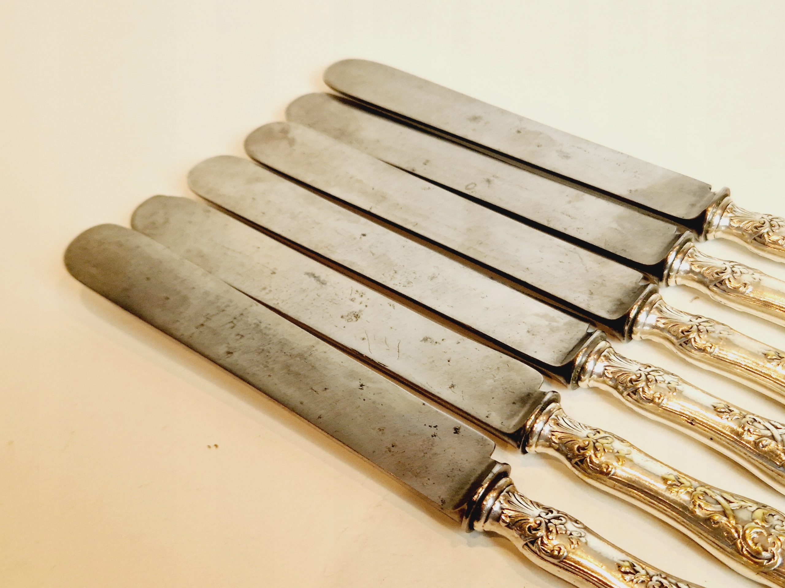 Оригинальное серебрение не сохранилось, видимых потертостей покрытия нет (кроме одной небольшой потертости на головке одного из ножей).