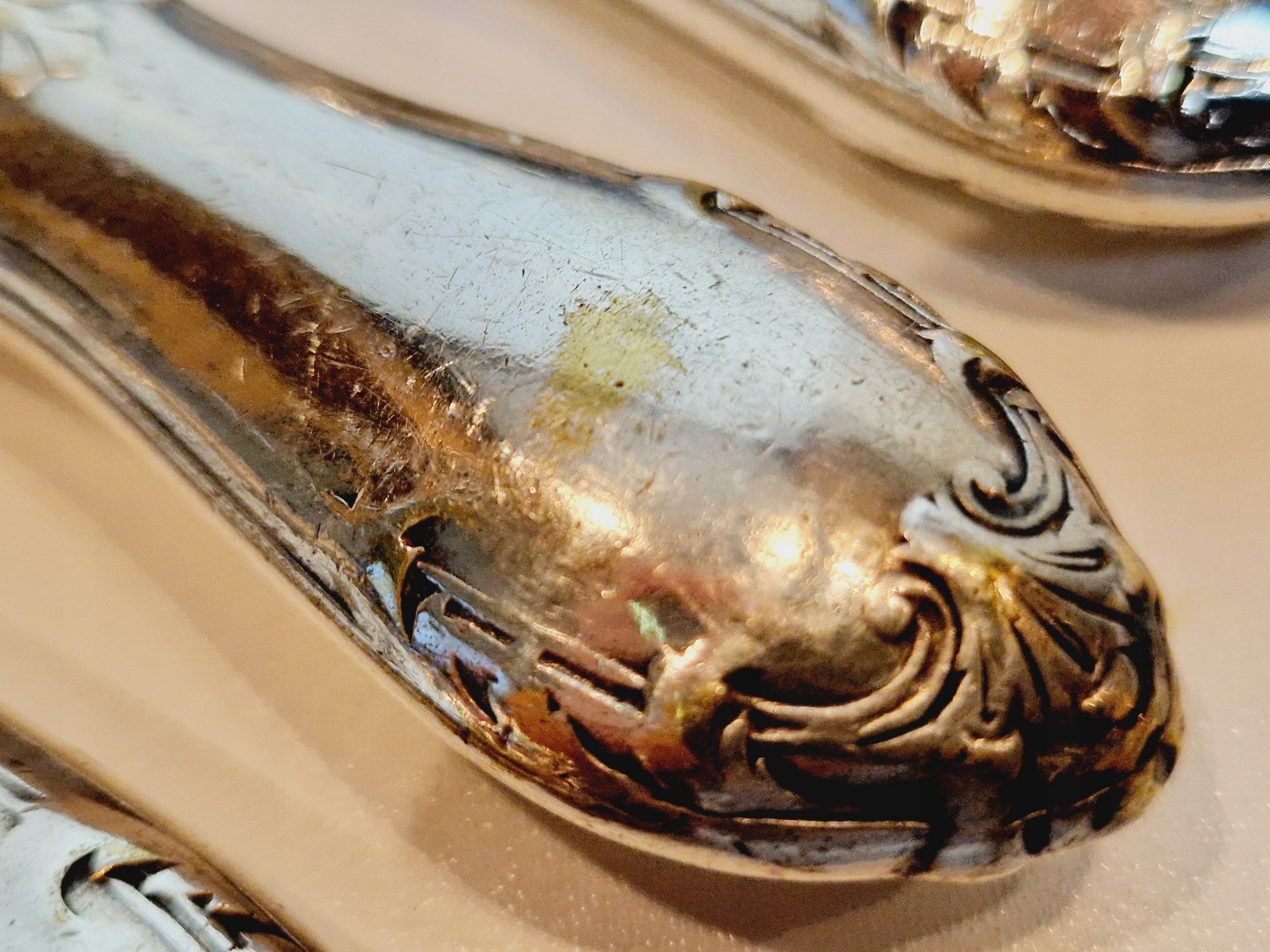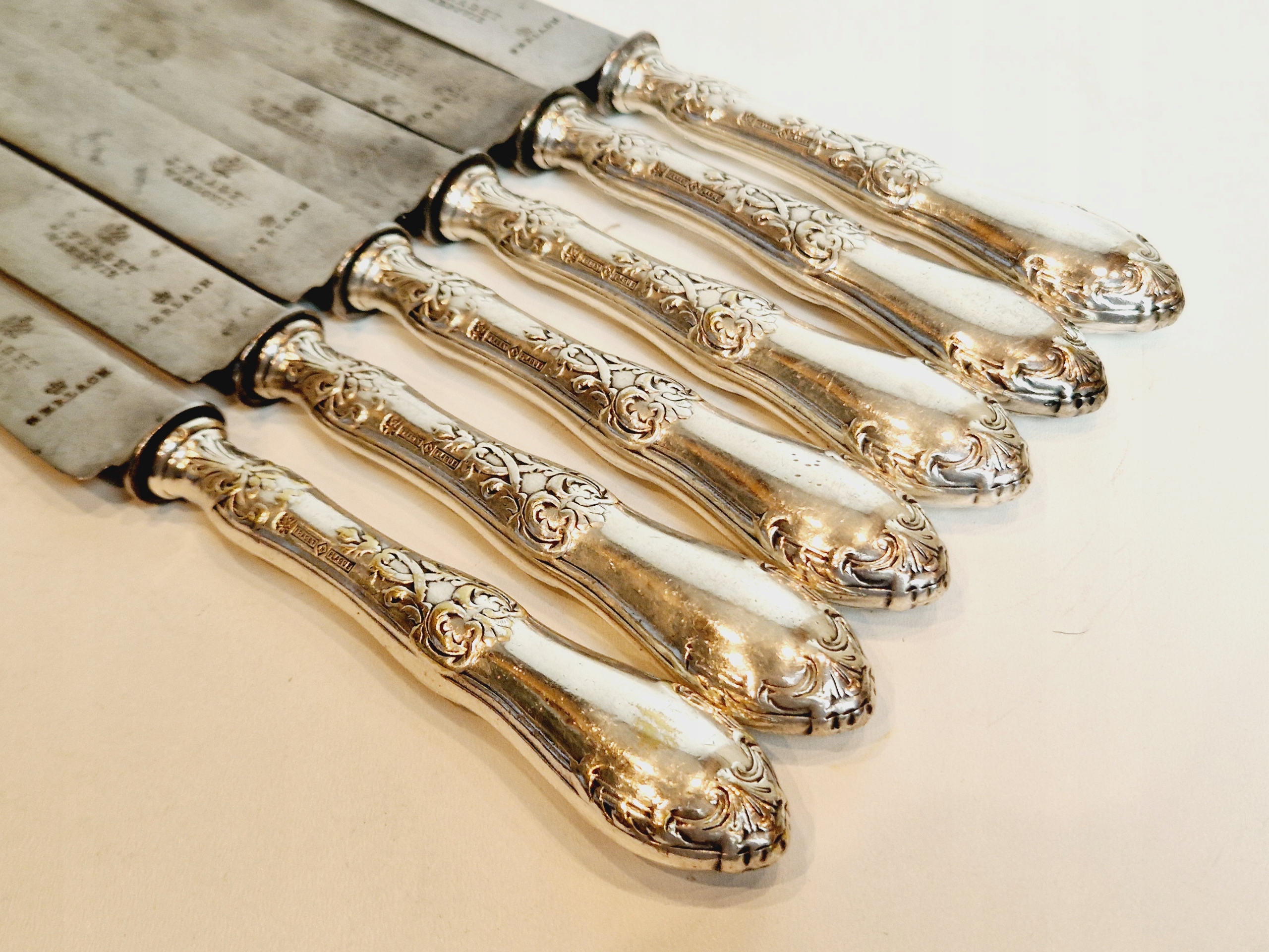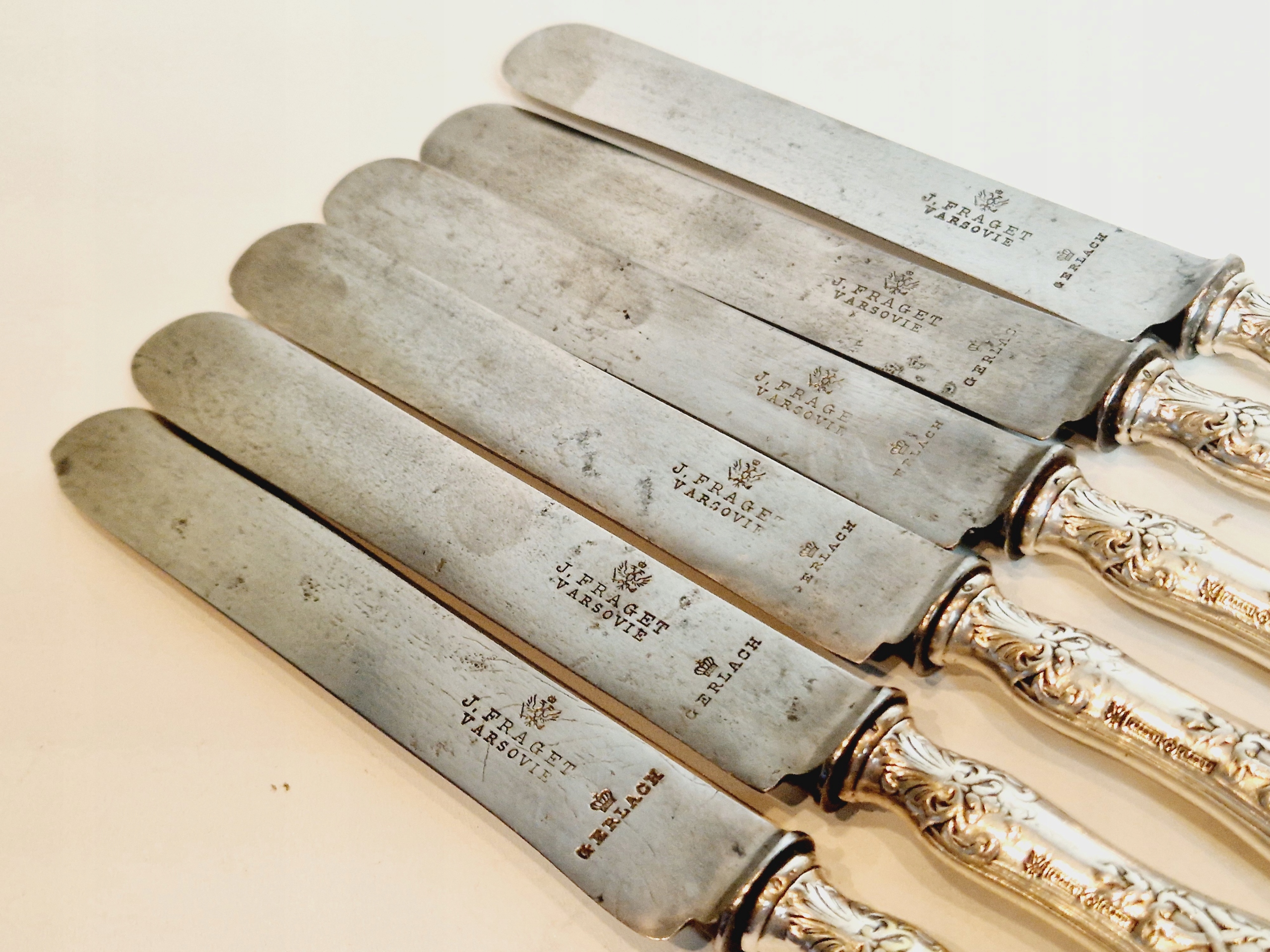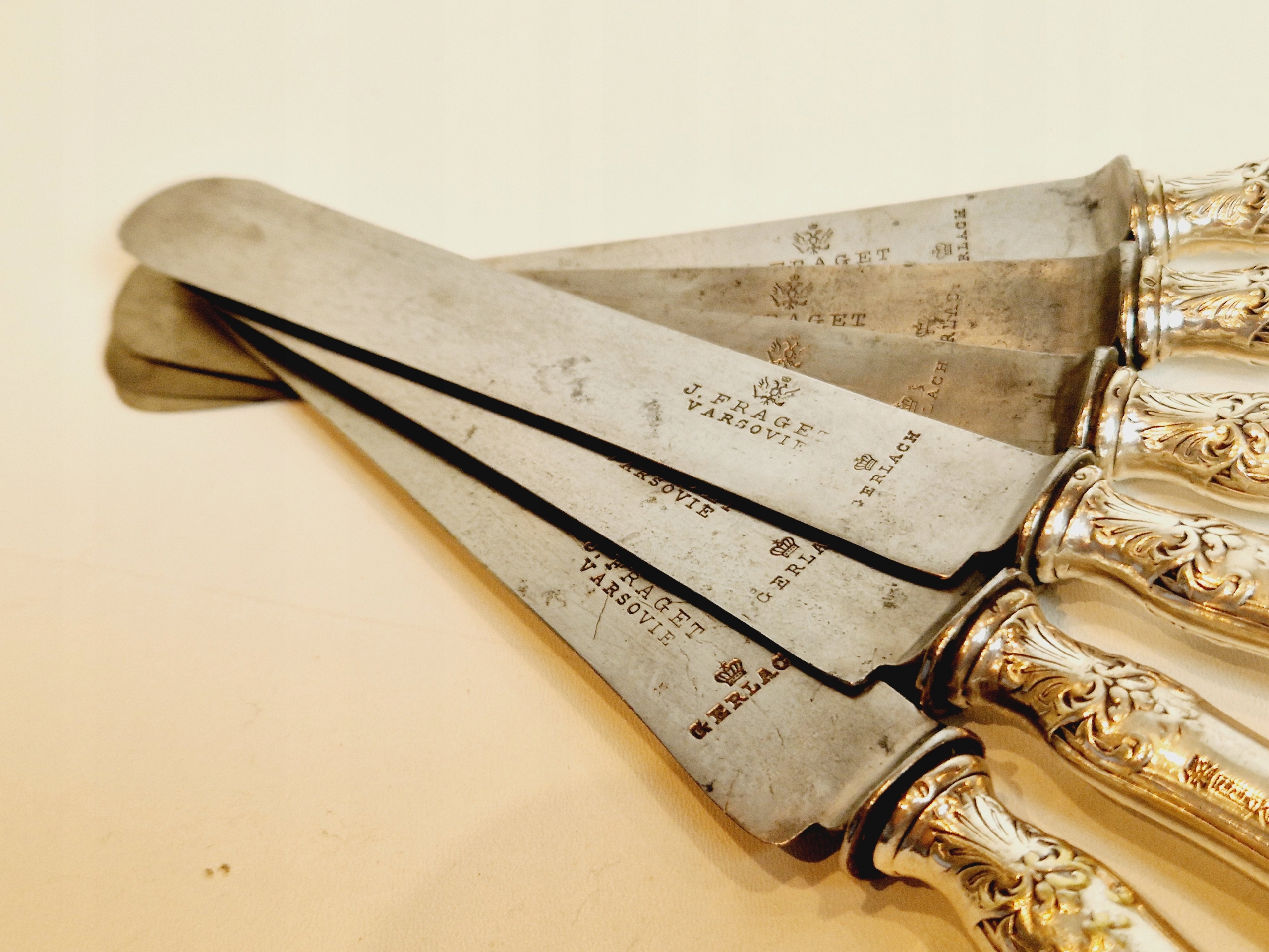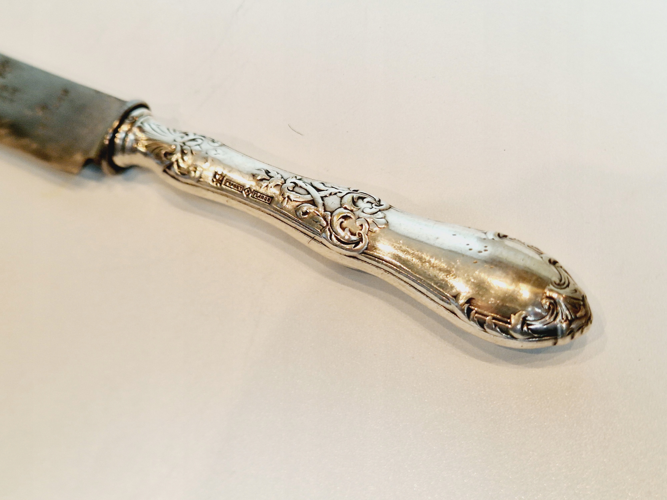 Оригинальное серебрение не сохранилось, видимых потертостей покрытия нет (кроме одной небольшой потертости на головке одного из ножей).