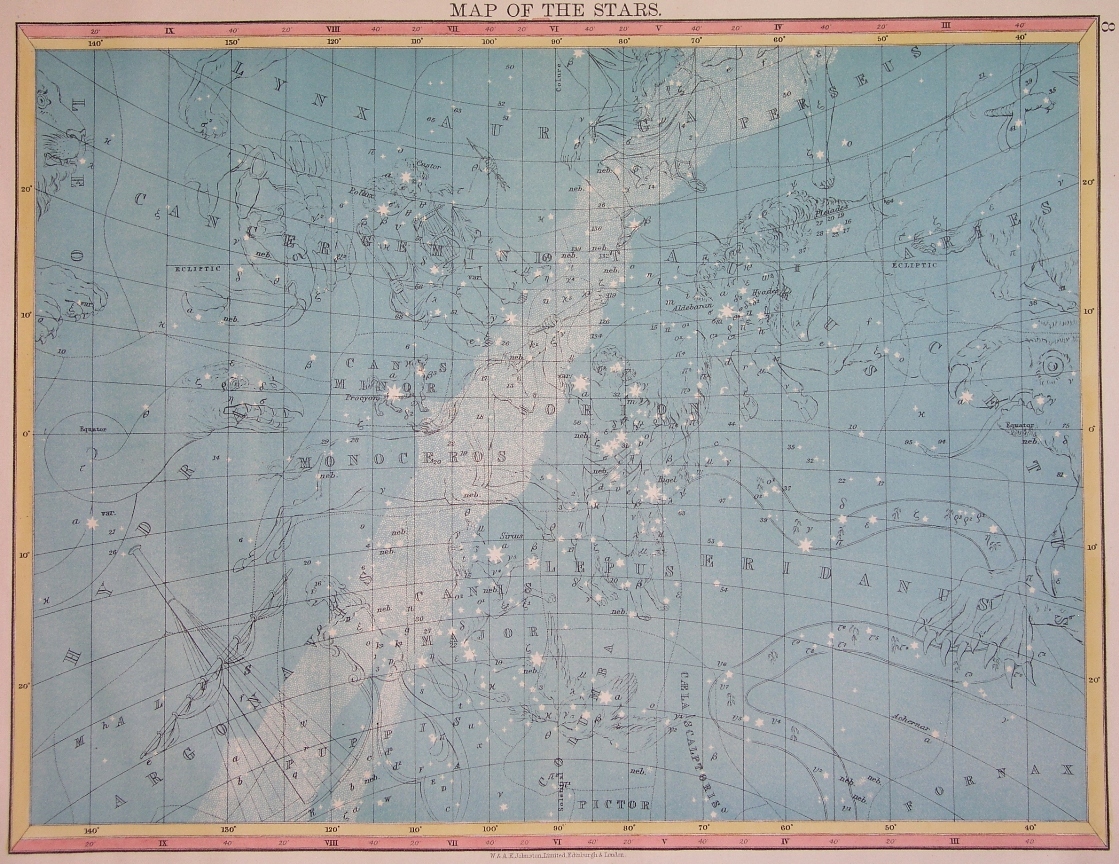 ОРИГИНАЛЬНАЯ КАРТОЧКА, НАПЕЧАТАННАЯ НА ДВУХ СТОРОНАХ: КАРТЫ НЕБА - фрагменты из английского атласа под названием "Атлас Виктории", изданного "W. & A.K. Johnson Ltd.", Лондон и Эдинбург, 1898 г. Они красочные. литографии четко отпечатаны на листе бумаги без атласа, с издательским нижним колонтитулом под рамами. ------ Размеры печатных частей примерно 19,5 на 25,5 см, карточек примерно 24 на 31 см. ----- Карта в очень хорошем состоянии (только незначительные загрязнения и изменение цвета бумаги).