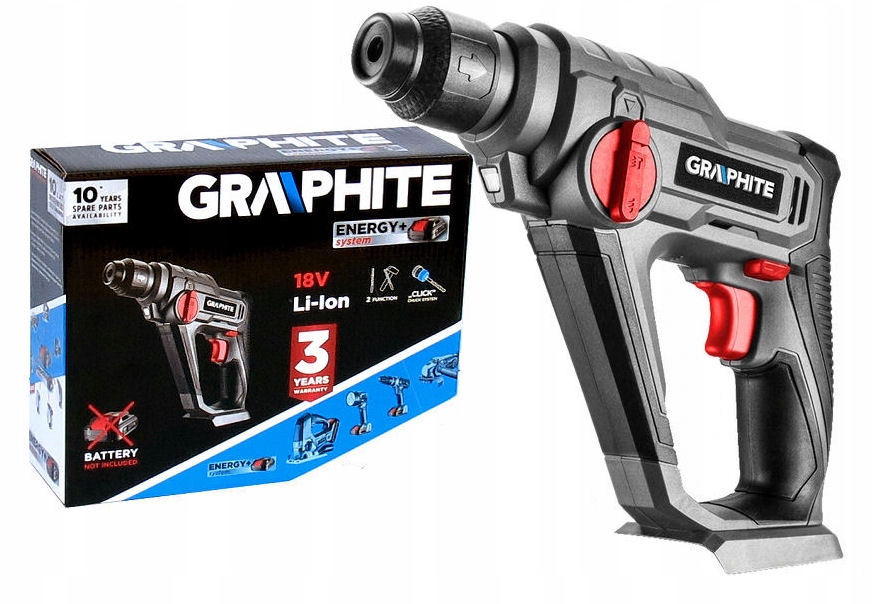 - Ударная дрель SDS+ GRAPHITE, совместимая с литий-ионными аккумуляторами GRAPHITE Energy+ 18 В.