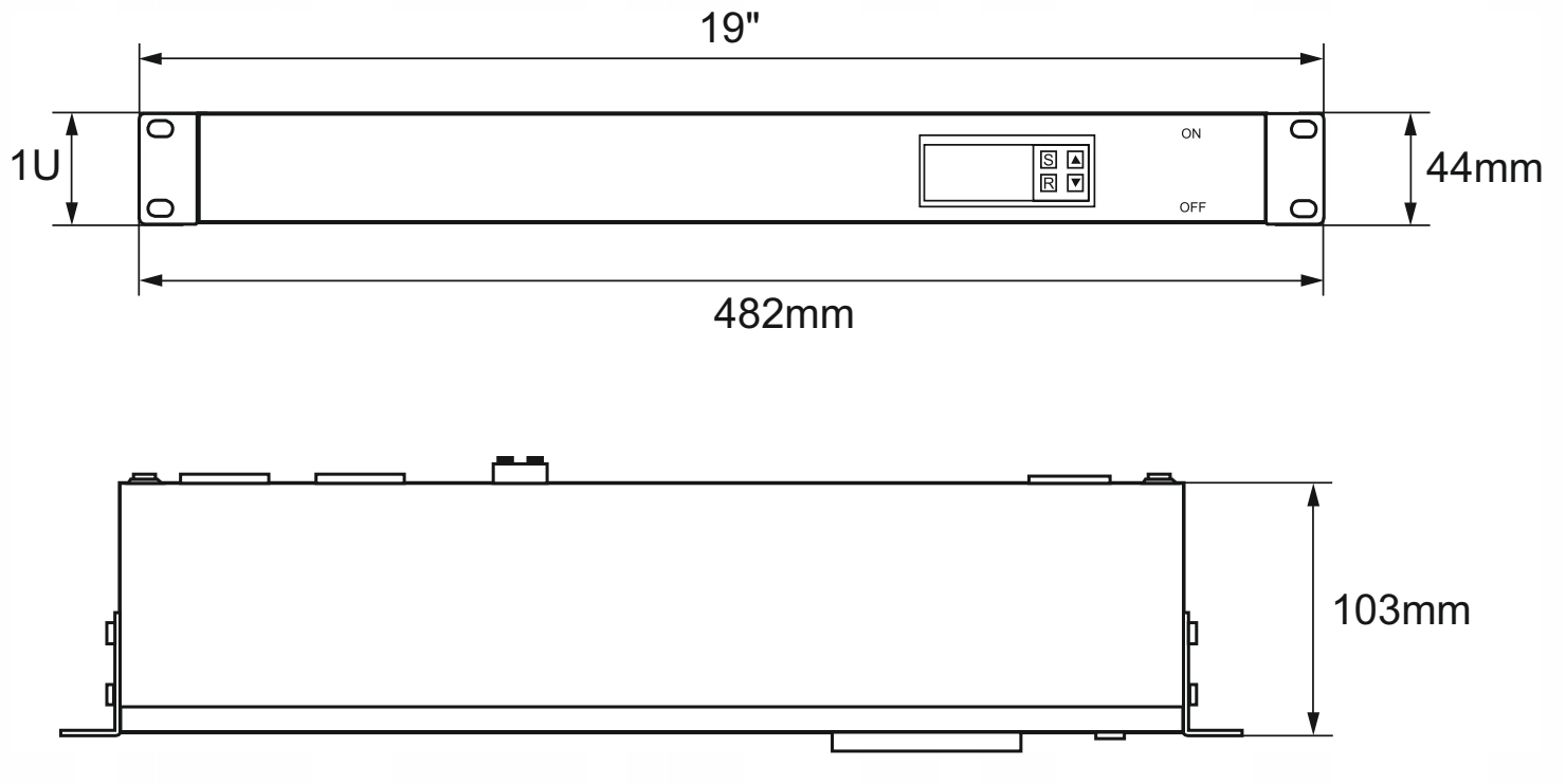 - Внешние размеры: Ш =482, H=44 D=103 [мм, +/-2]