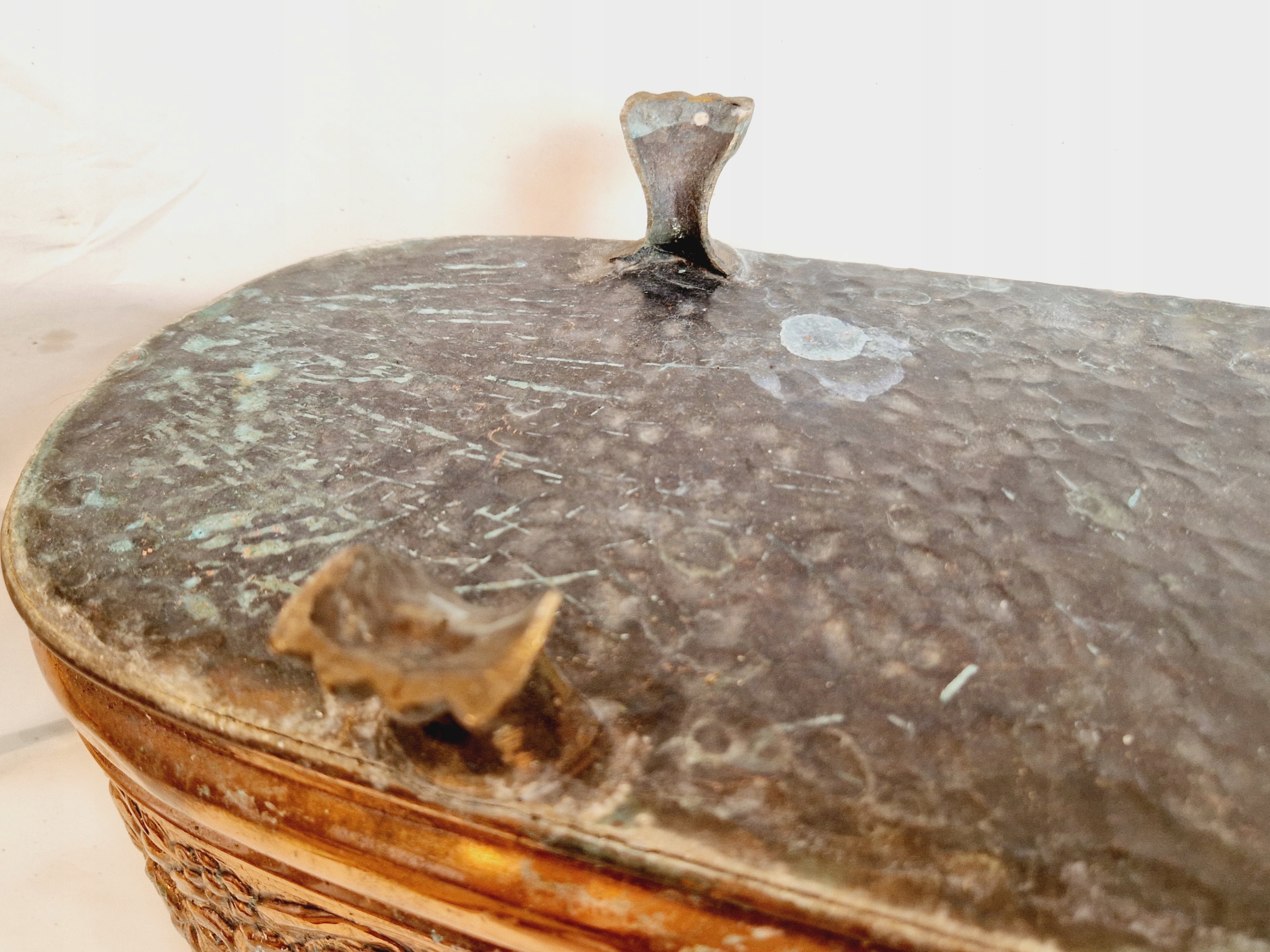 Медь не чистилась - покрыта оригинальной, старой, темной патиной с умеренным налетом ржавчины.