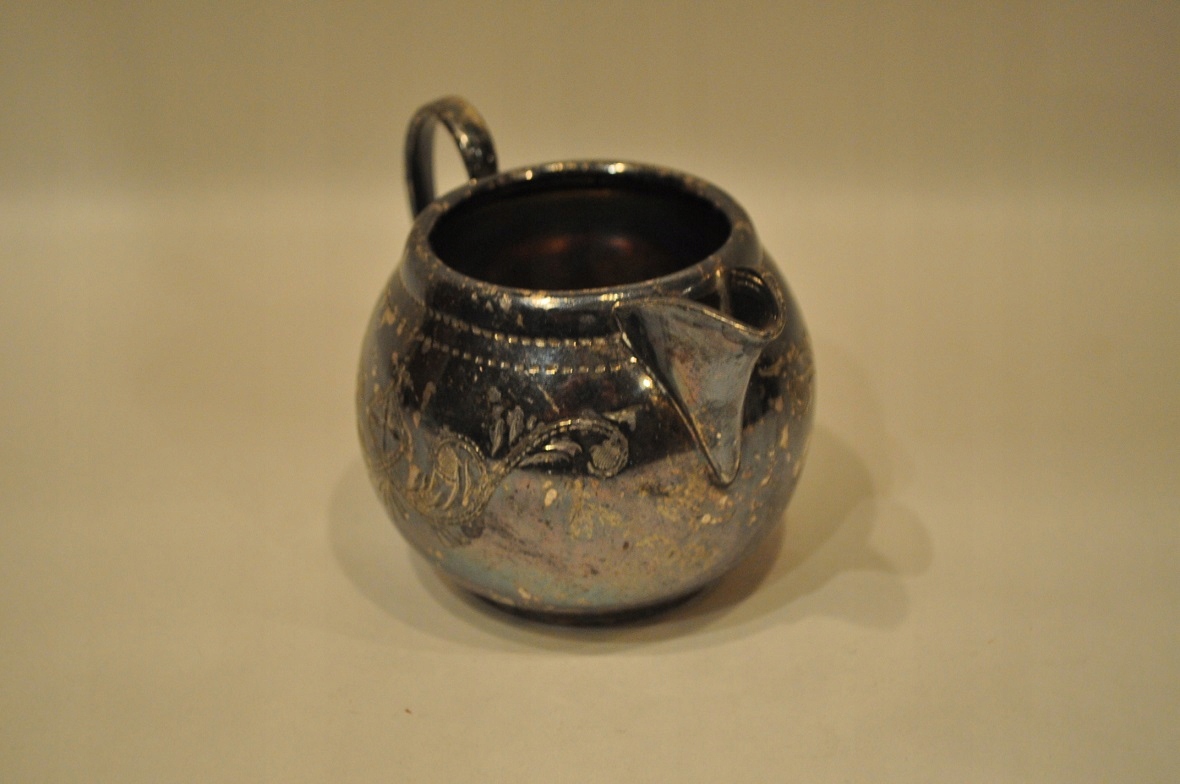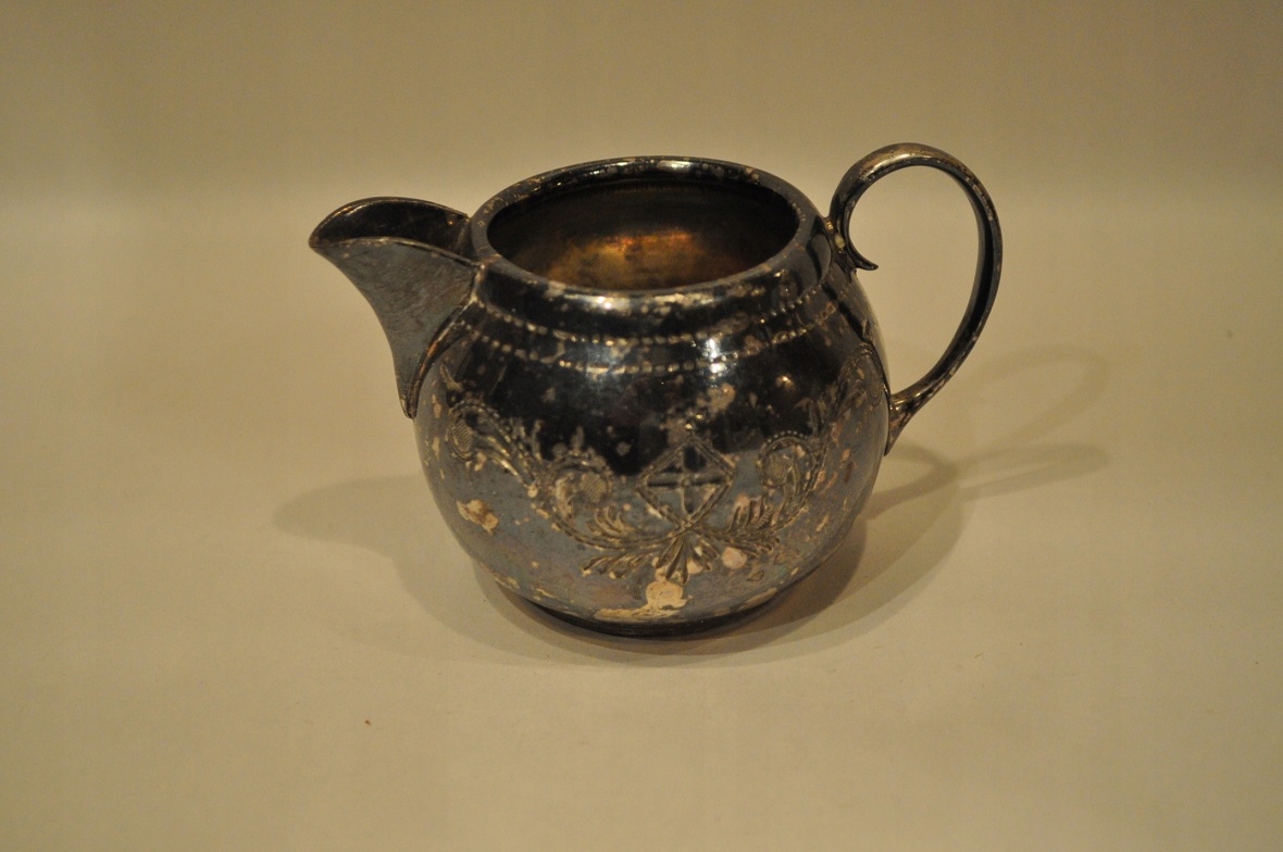 Серебряное покрытие молочника покрыто старым, темным патина.