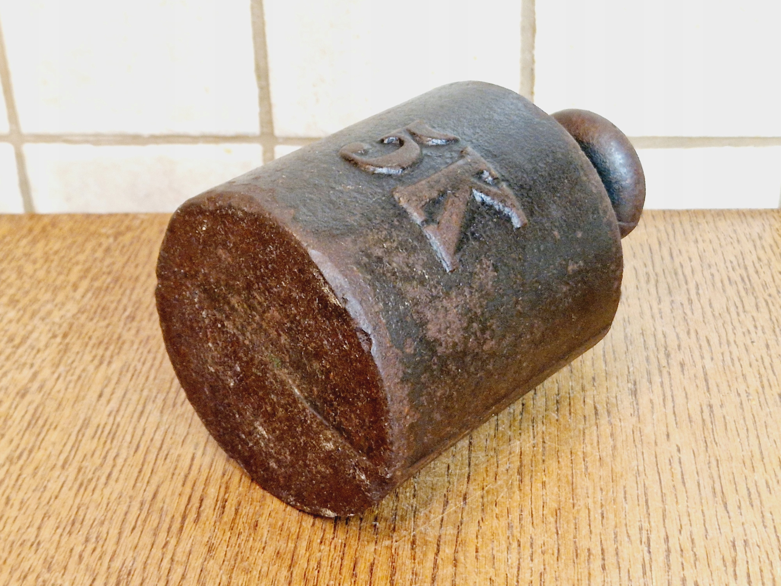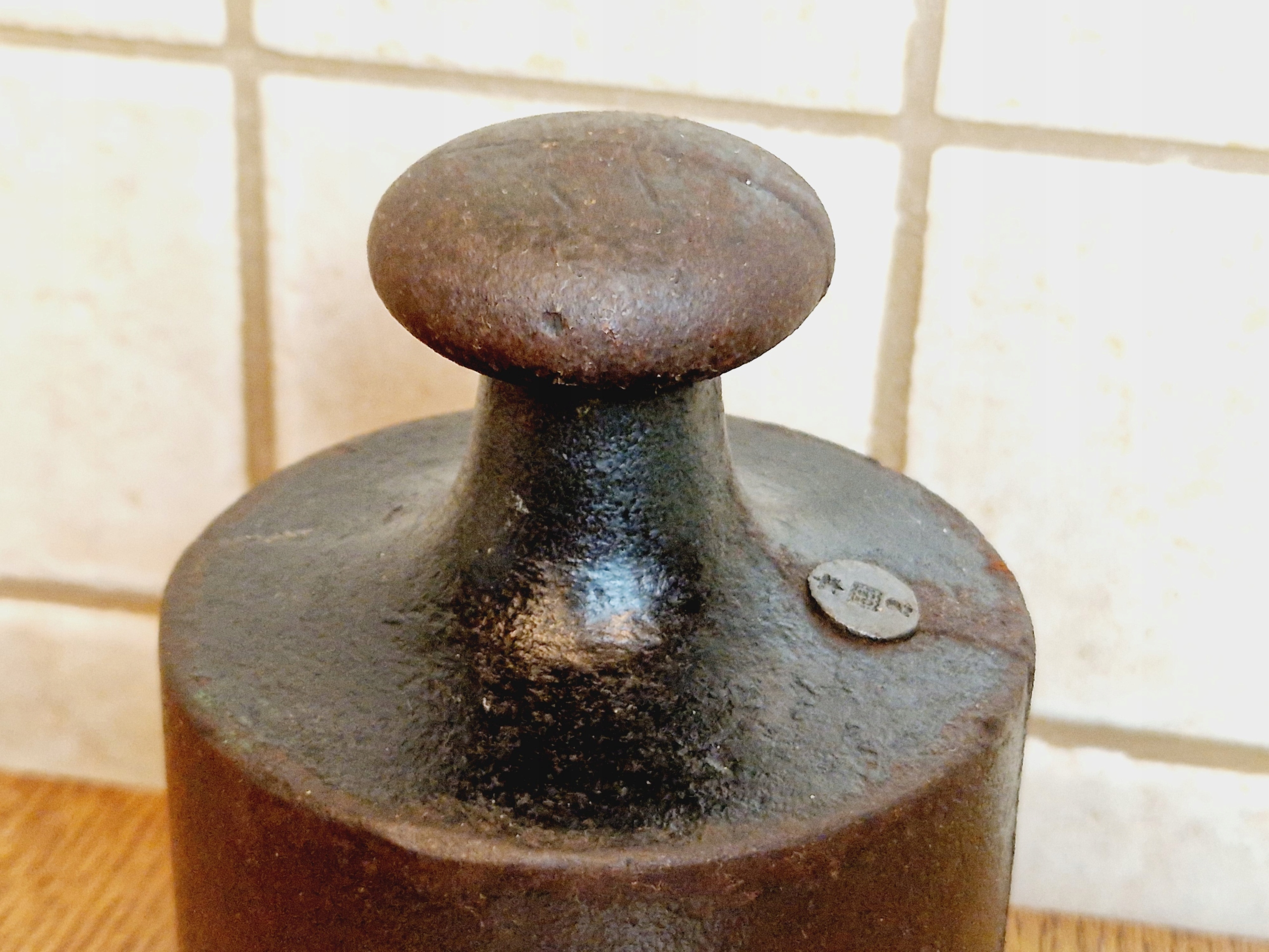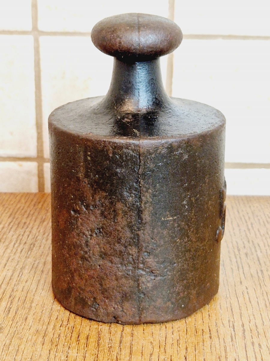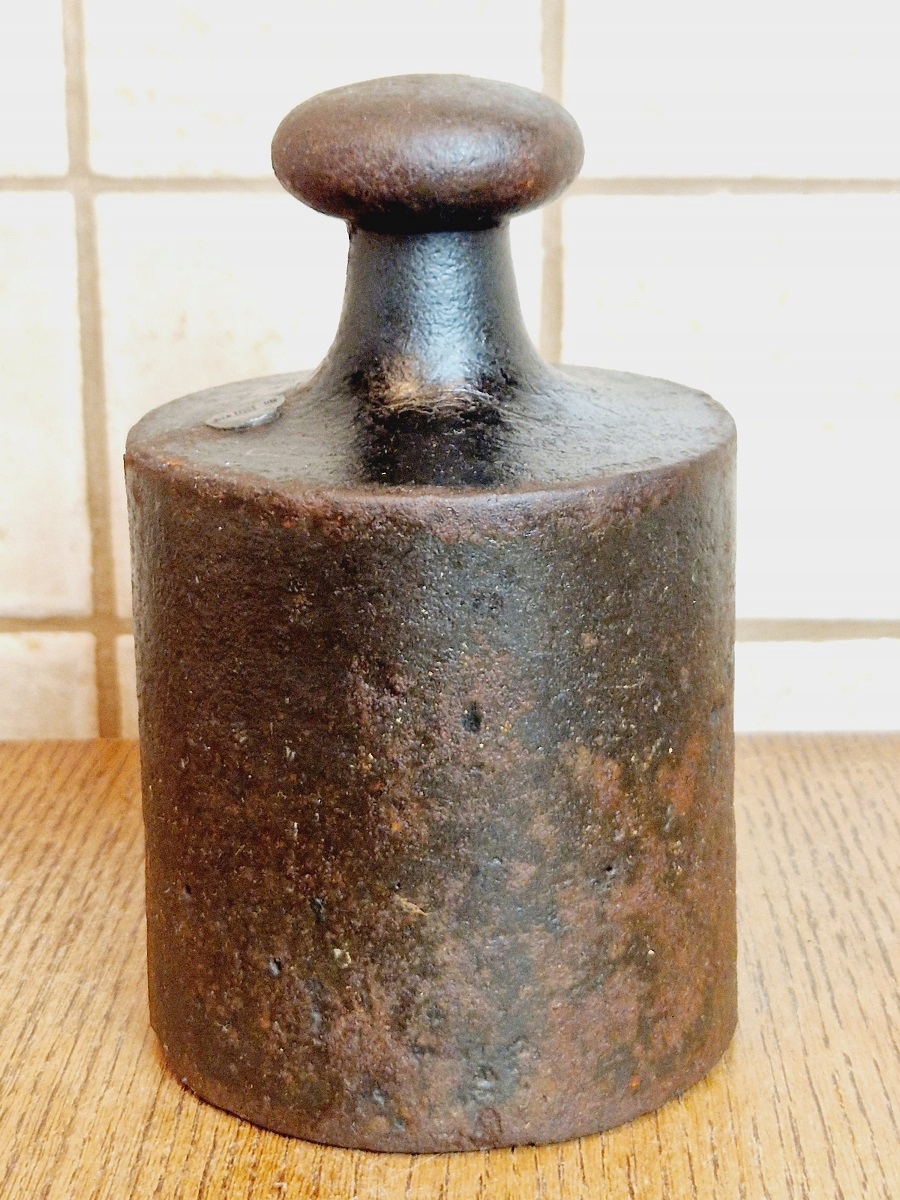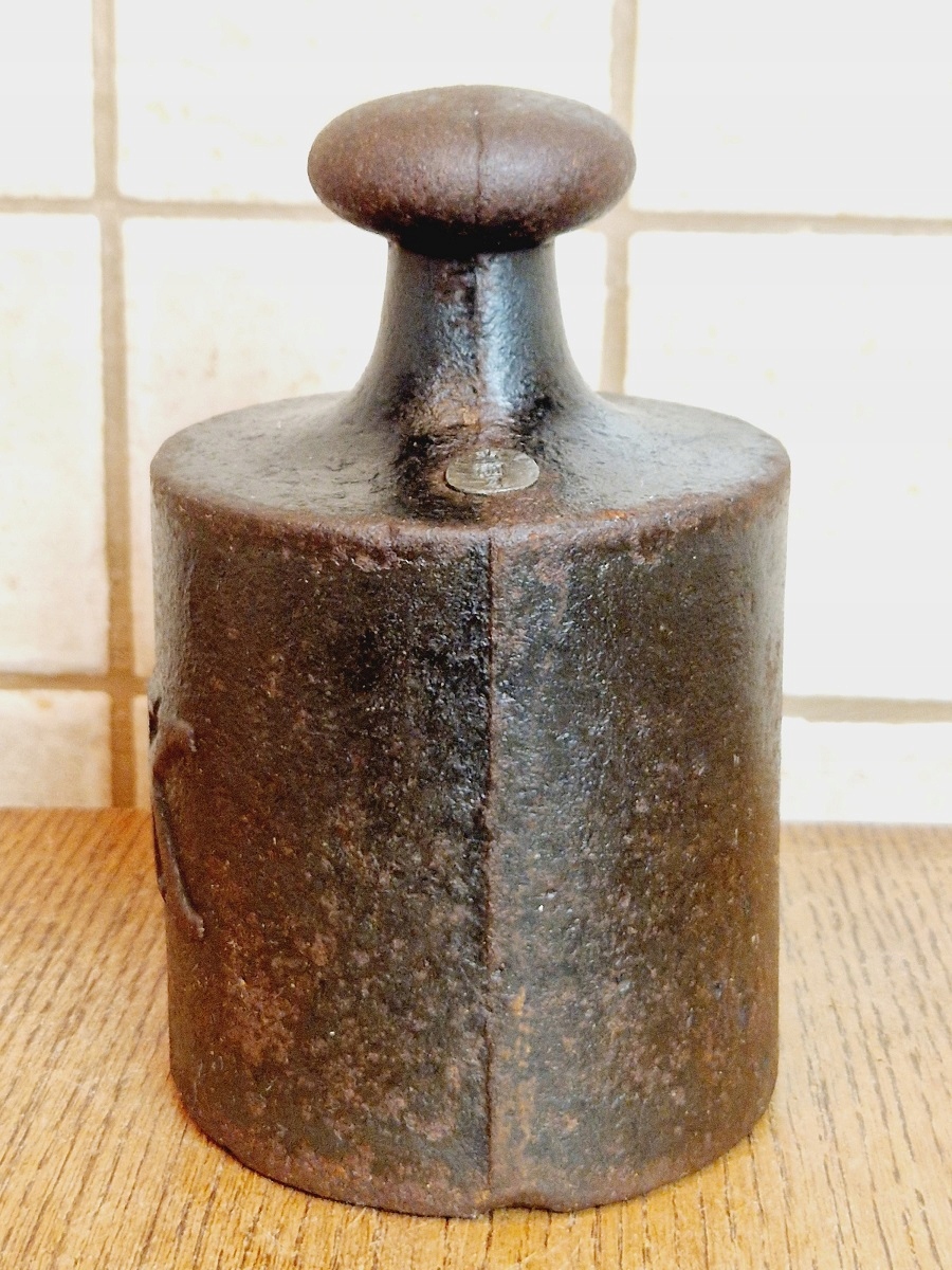 На воротнике гири имеется поверочное гнездо, заполненное свинцовой проверочной вставкой с разборчивыми знаками польской легализации.