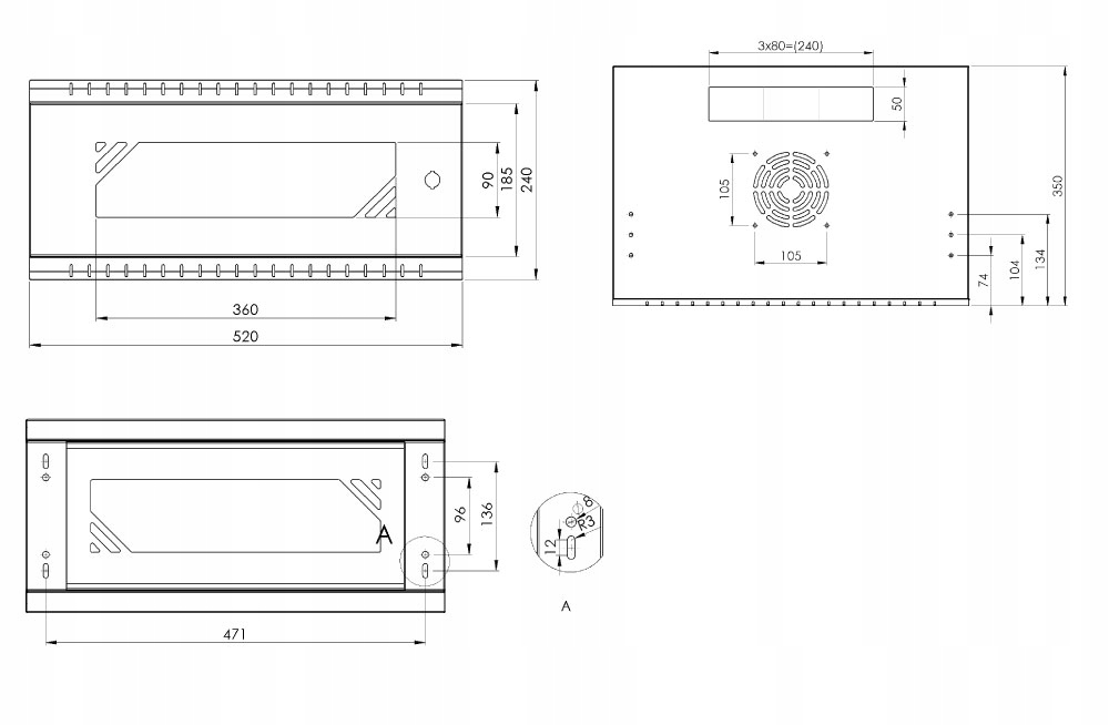 В нижней и верхней части шкафа 19" RACK имеется место для установки вентилятора (не входит в комплект) размерами 120 х 120 мм (расстояние между винтами: 105 х 105 мм). Это обеспечивает надлежащий отвод тепла изнутри шкафа.