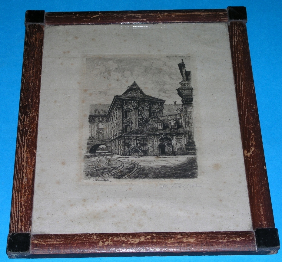 ОРИГИНАЛЬНАЯ графика, ETTING - Вроцлав, Университет - сделана Хельмой Фишер (еще без "Оэлс") около 1900 года, опубликована издательством "Бруно Рихтер Бреслау". Четкий отпечаток на листе бумаги ручной работы, подпись карандашом «Г. Фишер» с пометкой издательства «Бруно Рихтер, Бреслау»; четкое впечатление от гравюры на меди. ----- Графика в рамке, под стеклом, деревянная рама, коричневого цвета с черными углами. ---- Размеры картины примерно 10 на 14 см, а рамка примерно 20 на 25 см. На обратной стороне рамы наклейка багетной компании «Bruno Wenzel/Breslau/11 Albrechtsstrasse 11». -------- Состояние: потертость бумаги, рамка с явными следами использования. -------- РЕКОМЕНДУЮ.