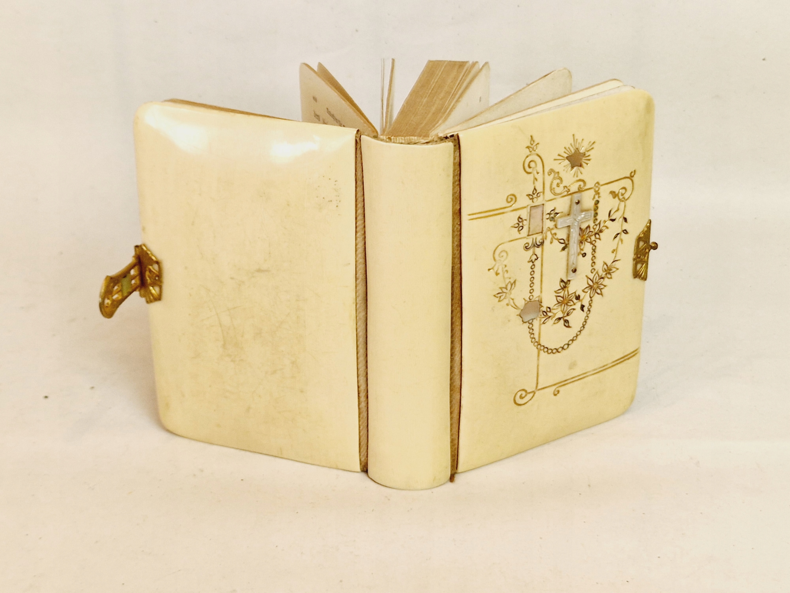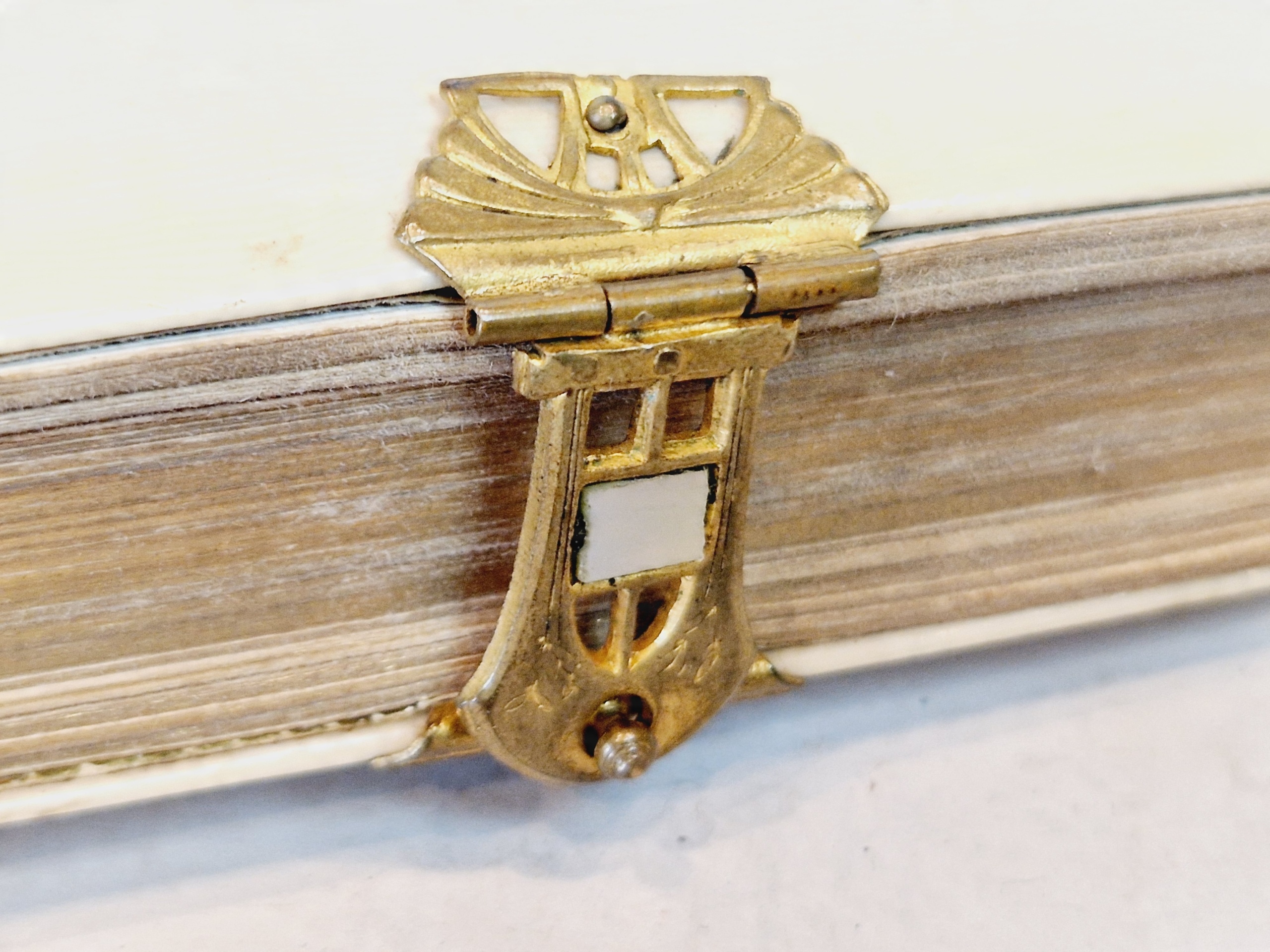 Переплет: пластик с аппликациями (перламутр), латунная застежка