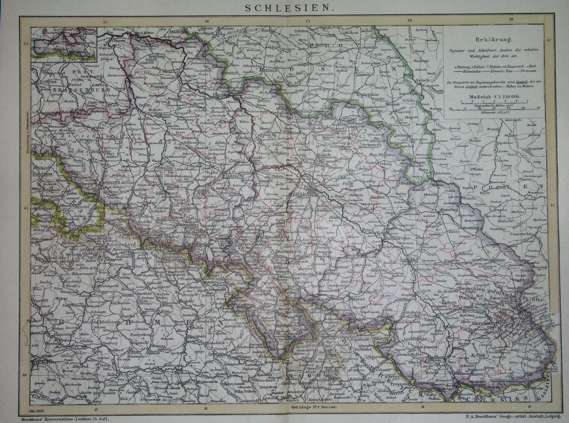 ОРИГИНАЛЬНАЯ КАРТАСилезии из "Brockhaus Konversations-Lexikon..."; опубликовано в 1908 году в Лейпциге. Это цветная литография, отпечаток на листе бумаги со сгибом атласа, двумя линейными масштабами и боковой картой оконечности Западной Силезии (район Хойерсверда). ----- Размер карты с рамкой: 28,5 на 21 см, лист ок. 30,5 на 25 см. ------ Состояние очень хорошее (минимальные загрязнения и обесцвечивание бумаги).
