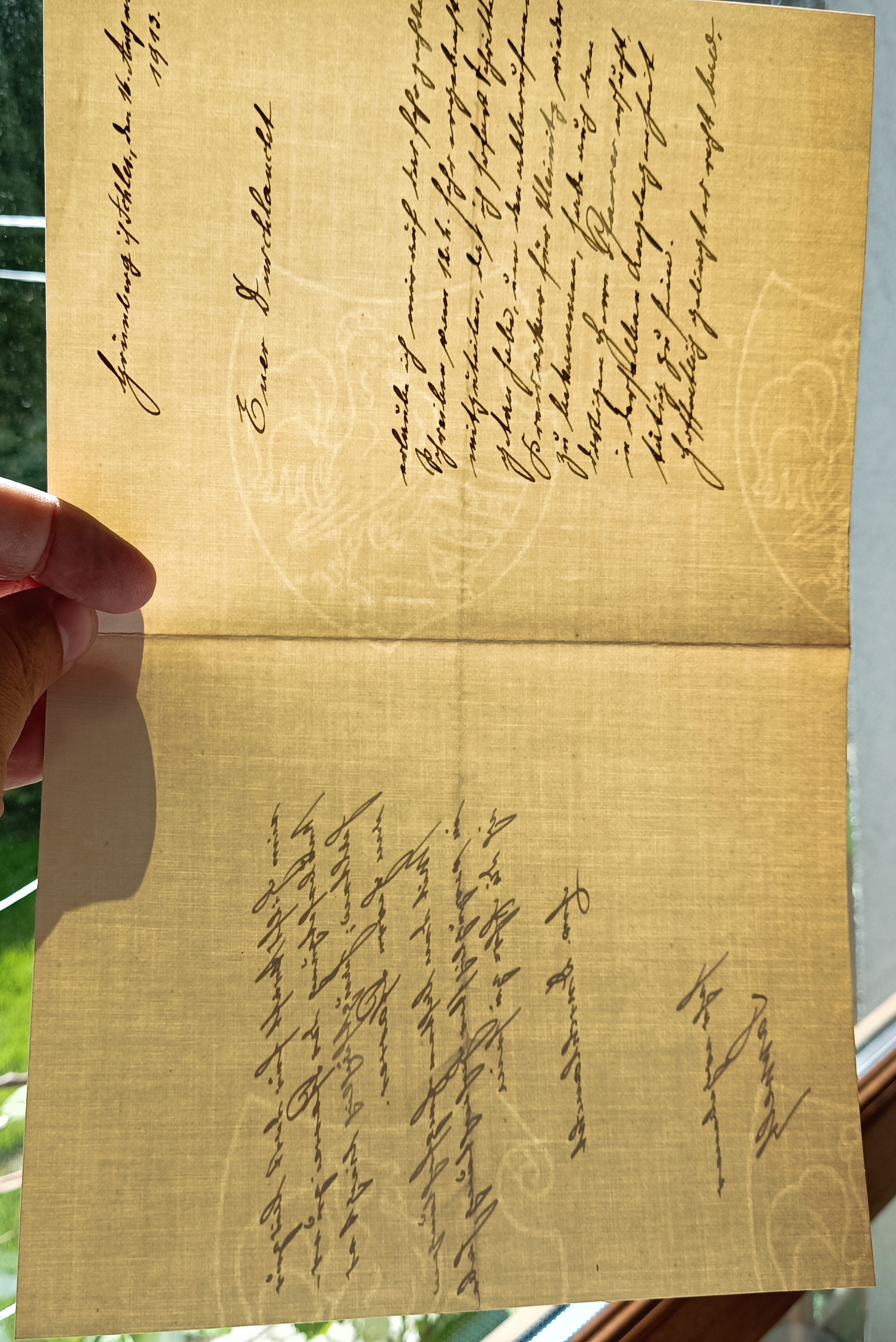 Грунберг 1913. Письмо, написанное в Зилоне Горе на необычной бумаге - высокое качество с водяным знаком - петух и щит, надпись в герме. Я не знаю, является ли это продуктом местной бумажной фабрики в KRęPA или иностранного продукта.