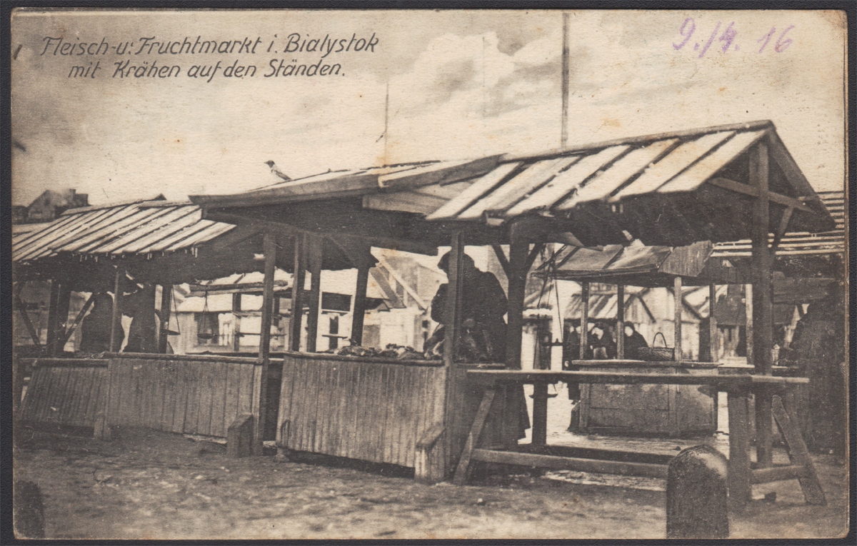 1916 "Fleisch -und: Fruchtmarkt i. Bialystok mit Krähen auf den Standen", из почтового обращения, издание "Hofphotograph Kühlewindt, Königsberg i. Pr. No 1437a"; отправлено почтой Германии.