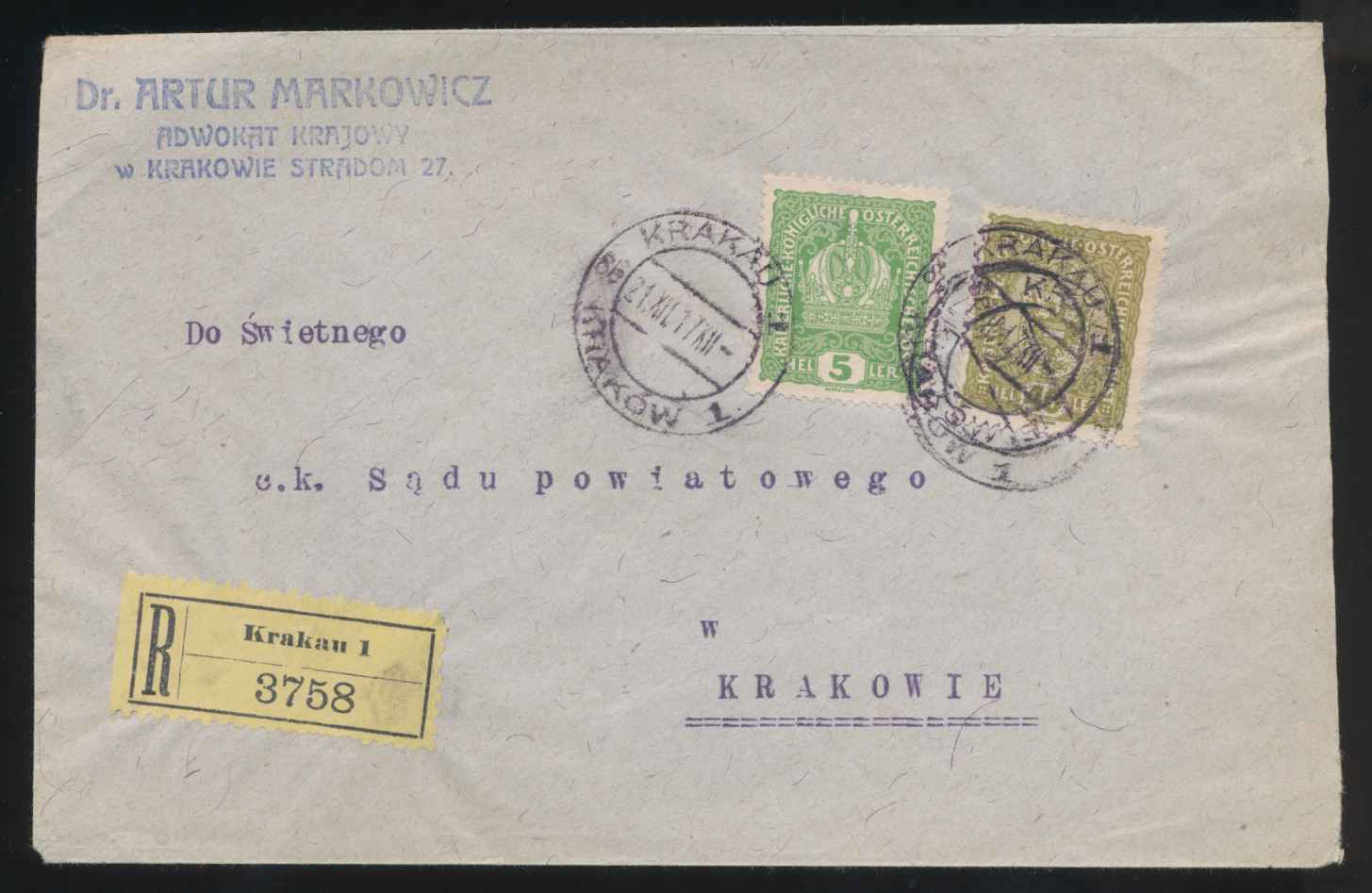 1917 г. ПМВ, ОА, заказной конверт Р-КРАКАУ 1, местный.