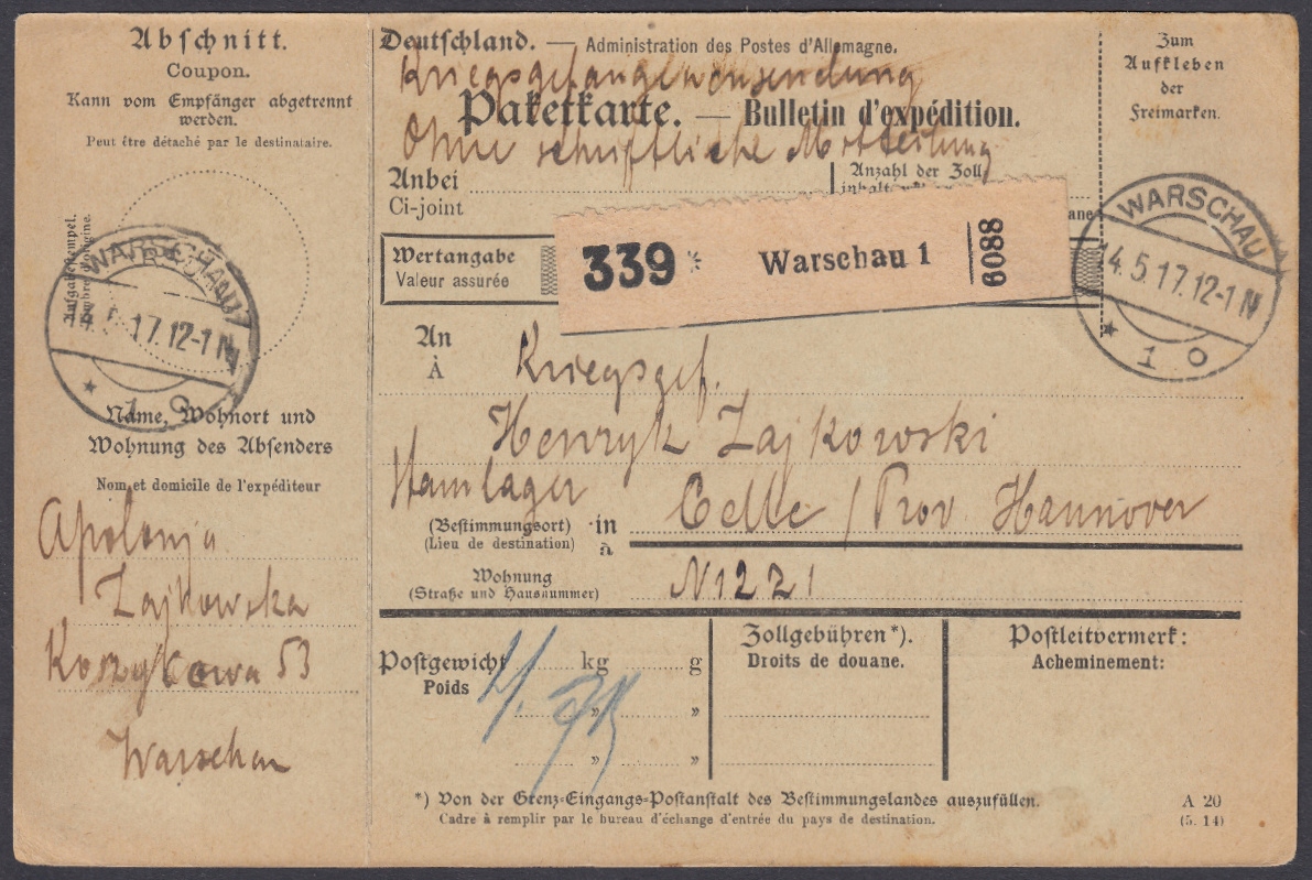 1917 WARSZAWA - PRZEKAZ PACZKOWY