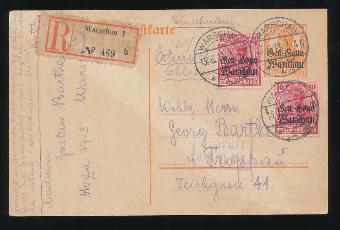 1918 I WW, немецкая оккупация, целая GGW, Franchled, зарегистрирован R-Warsaw 1 для Opawa. Стоимость доставки PLN 10. Приоритетное зарегистрированное письмо. Регионалия, небольшая родина - Варшава, Варсовиана. h1>