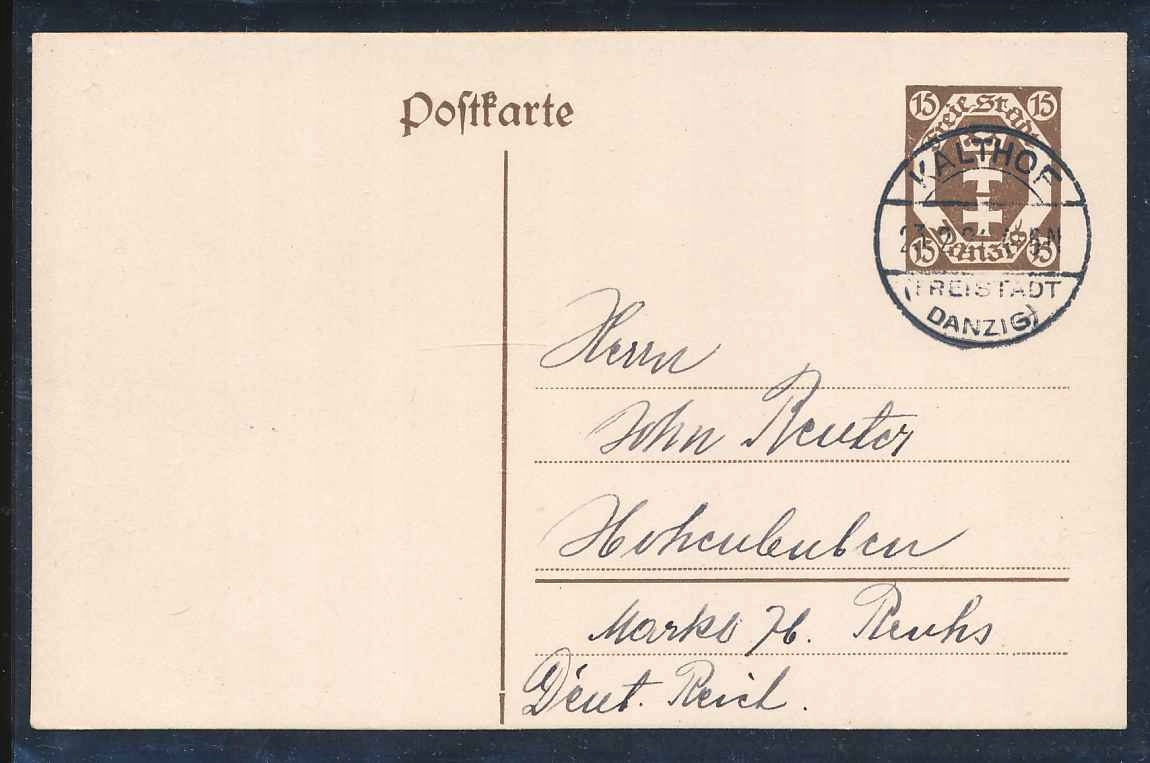 1921 Свободный город Гданьск, полный 15pfg. Cp.10a, Kalthof/Kałdowo в Германию. Стоимость доставки PLN 10. Приоритетное зарегистрированное письмо. Регионалия, небольшая родина - Калдово, Мальборк, Вольн Мистто Гданьск. h1>