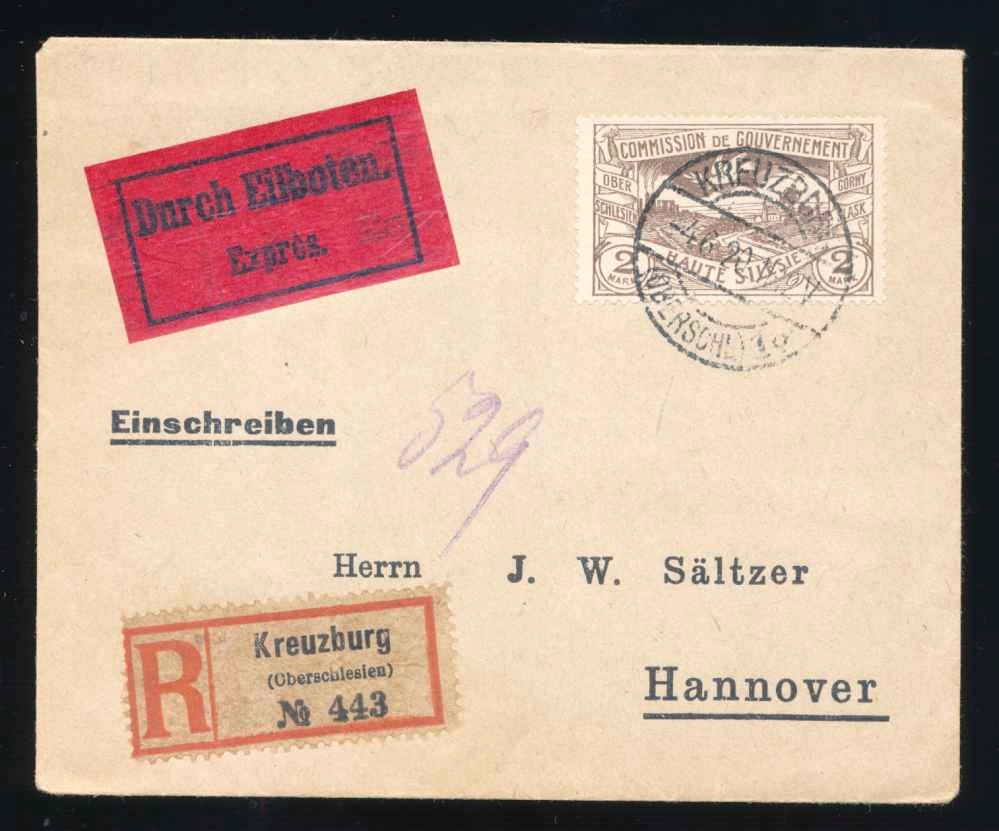 1922 г. плебисцит в Верхней Силезии, экспресс-регион R-Kreuzburg/Kluczbork в Германию. Стоимость доставки PLN 10. Зарегистрированное письмо приоритет. h1> Регионалия, небольшая родина - Kluczbork. h1>