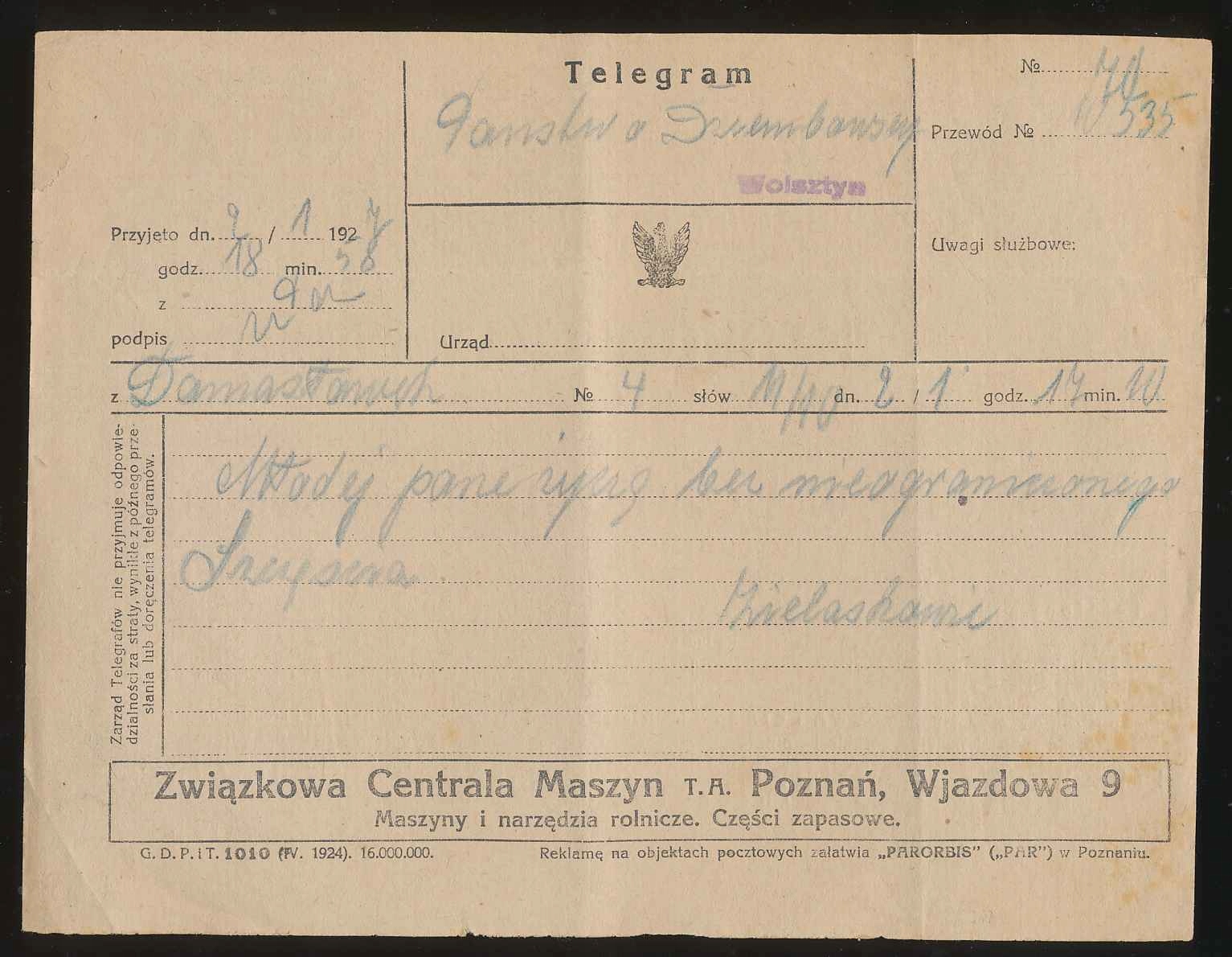 1927 PMW, GDPIT форма 1010 IV.1924, РЕКЛАМНЫЙ TELEGRAM UNION MACHINE HQ, ПОЗНЬ. НА ОБРАТНОЙ СТОРОНЕ 4 ИНТЕРЕСНЫХ ОБЪЯВЛЕНИЯ ИЗ ПОЗНАНИ, отправленные в ДОМАСЛОВИЦЕ, в ВОЛЬШТЫН. Стоимость доставки 10 злотых. Приоритетное заказное письмо. РЕГИОНАЛЫ, МАЛАЯ РОДИНА - ПОЗНЬ, ЛЮБОНЬ, ВОЛЬШТЫН. ТЕМЫ - ТЕЛЕГРАММЫ, РЕКЛАМА.