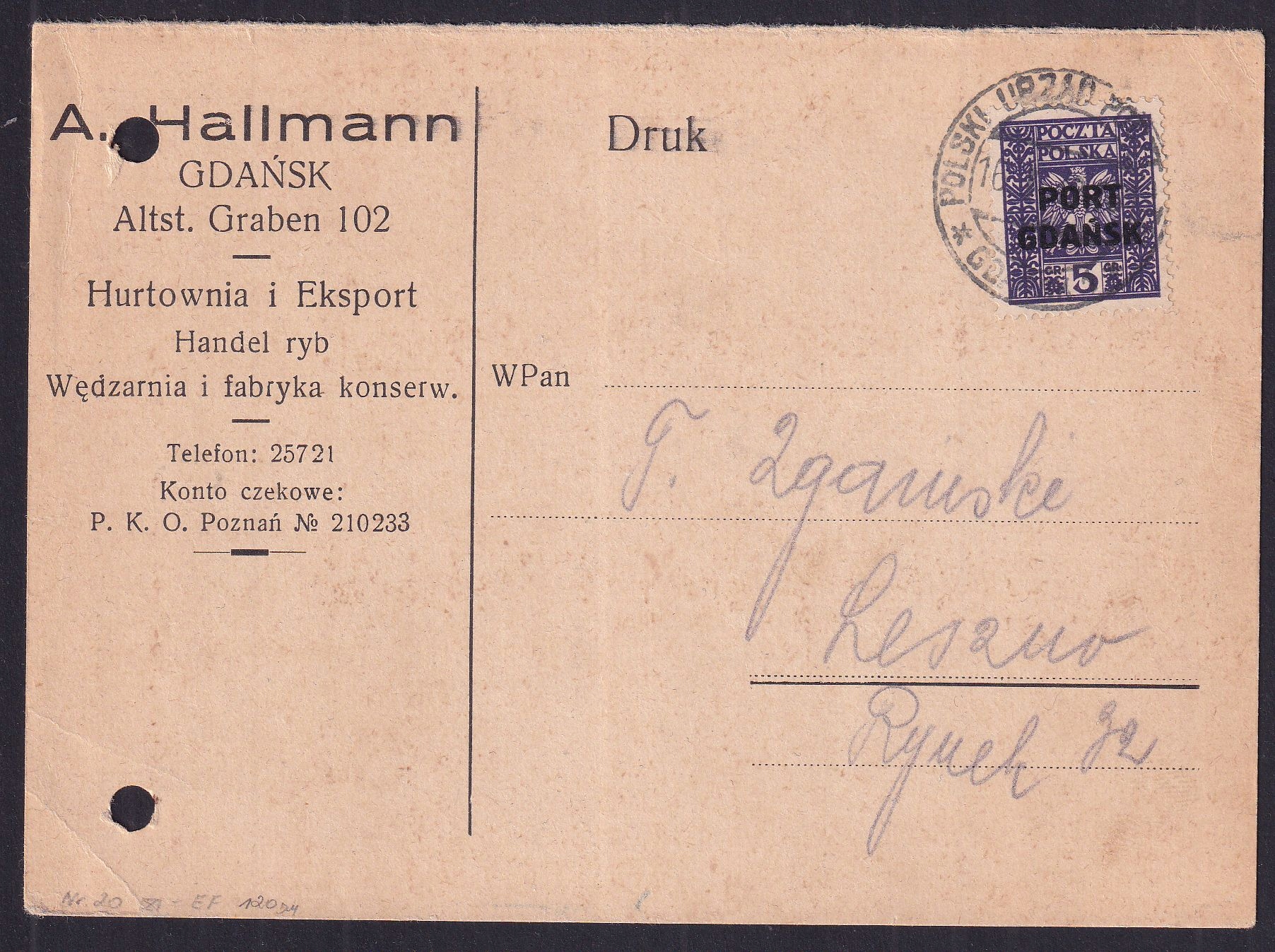 1934 г. Карточка заказа Гданьского порта с маркой Fi 23.