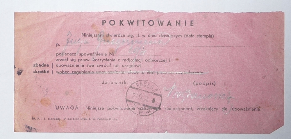 РАБКА 1935 ГОДА - ОТКАЗ ОТ ПРАВА ИСПОЛЬЗОВАНИЯ РАДИОПРИЕМНОЙ СТАНЦИИ