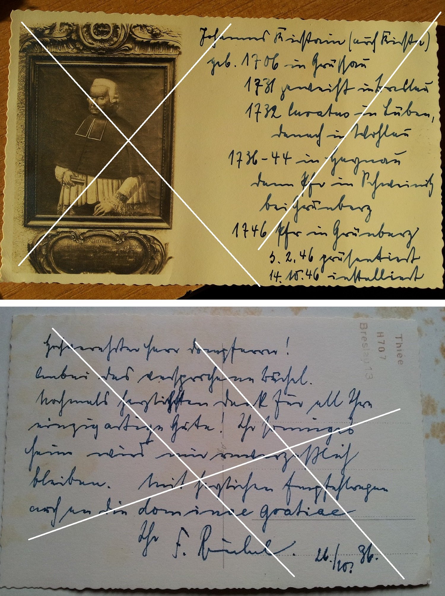 Портрет – сфотографированная картина – изображен Иоганн Кирштайн. Рядом с изображением добавлено: родился в 1706 году в Груссау (?) родился в 1706 году в Кшешуве? Дальнейшие дополнения: 1731 г. Бреслау - Вроцлав, 1732 г. - куратор в Люббене - Любине, 1736-44 гг. - приходской священник в Свиднице близ Зеленой Гуры, 1746 г. - приходской священник в Зеленой Гуре.