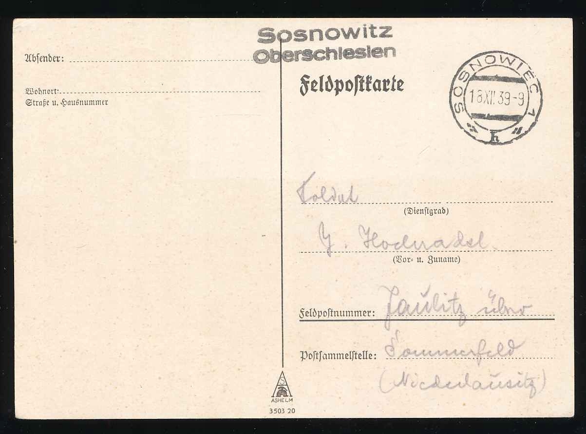 1939.xii.18. Вторая мировая война, он, карта с импровизированными штампами Сосновиц Обершляйен, и польский Сосновиц. Регионалия, небольшая родина - Сосноу. h1>