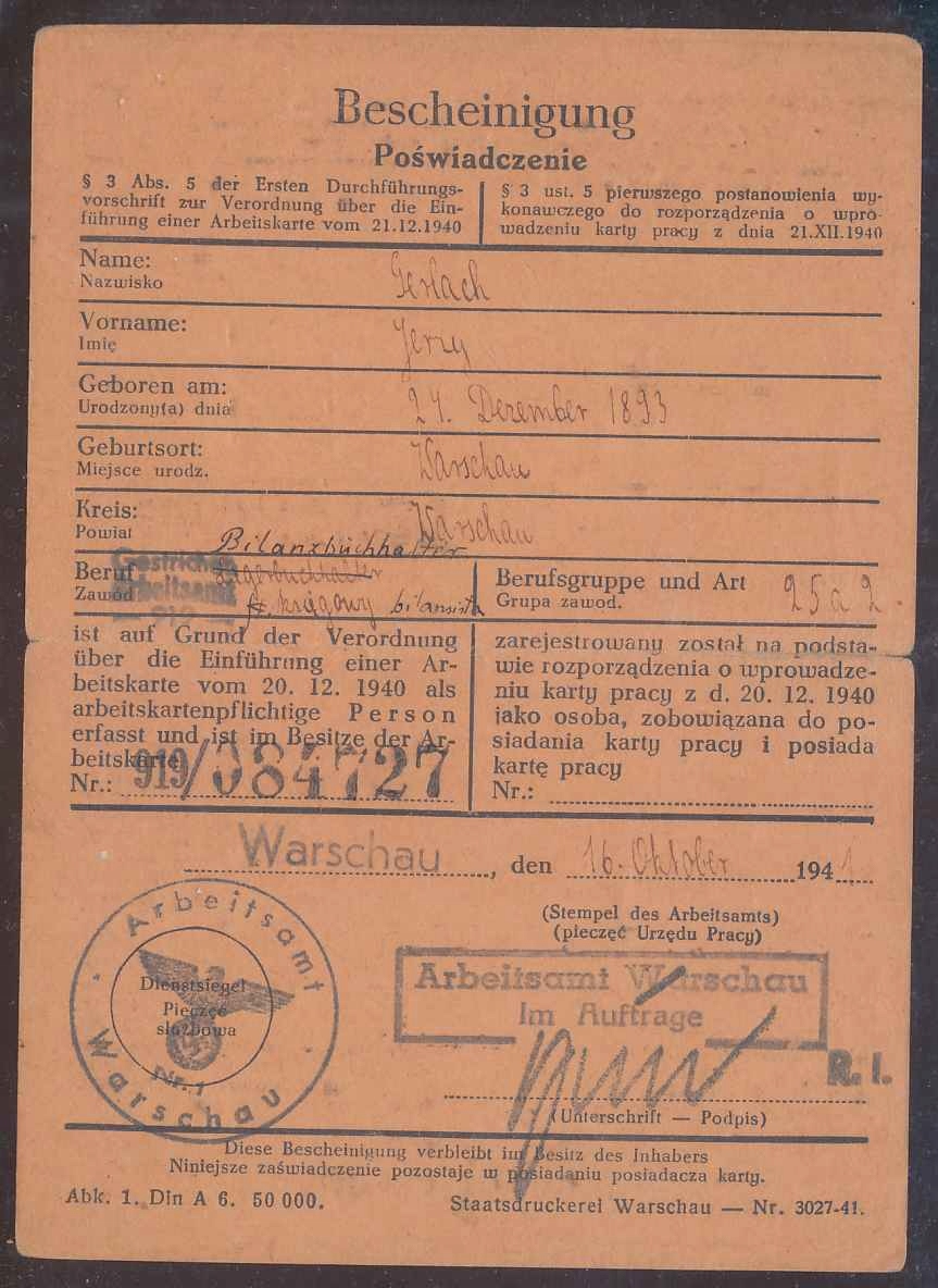 1941 год ВОВ, ГГ, ВАРШАВА, СВИДЕТЕЛЬСТВО О РАБОТЕ.