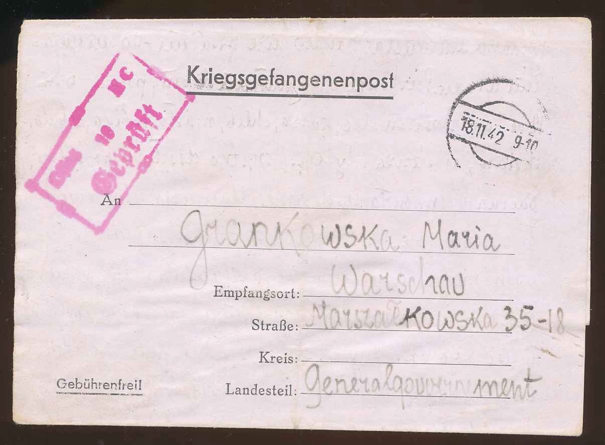 1942 Лагерь Офлаг II C Вулденберг, письмо военнопленного военнопленным Варшаве.