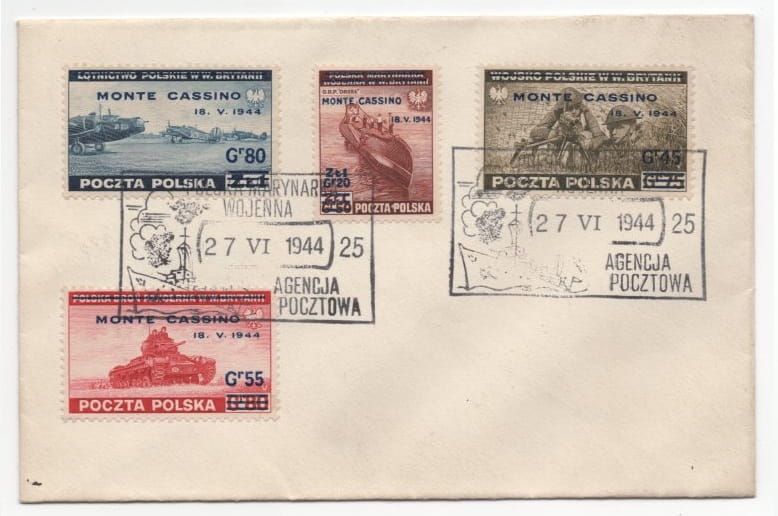 Конверт FDC с серией из 4 марок «Взятие Монте» Кассино», опубликованной 27 июня 1944 года в журнале «Эмиграция». Участие было отмечено на марках. Поляки в боях у Монте-Кассино. Печать «Монте-Кассино 18.05.1944» и новая. Номинальная стоимость.