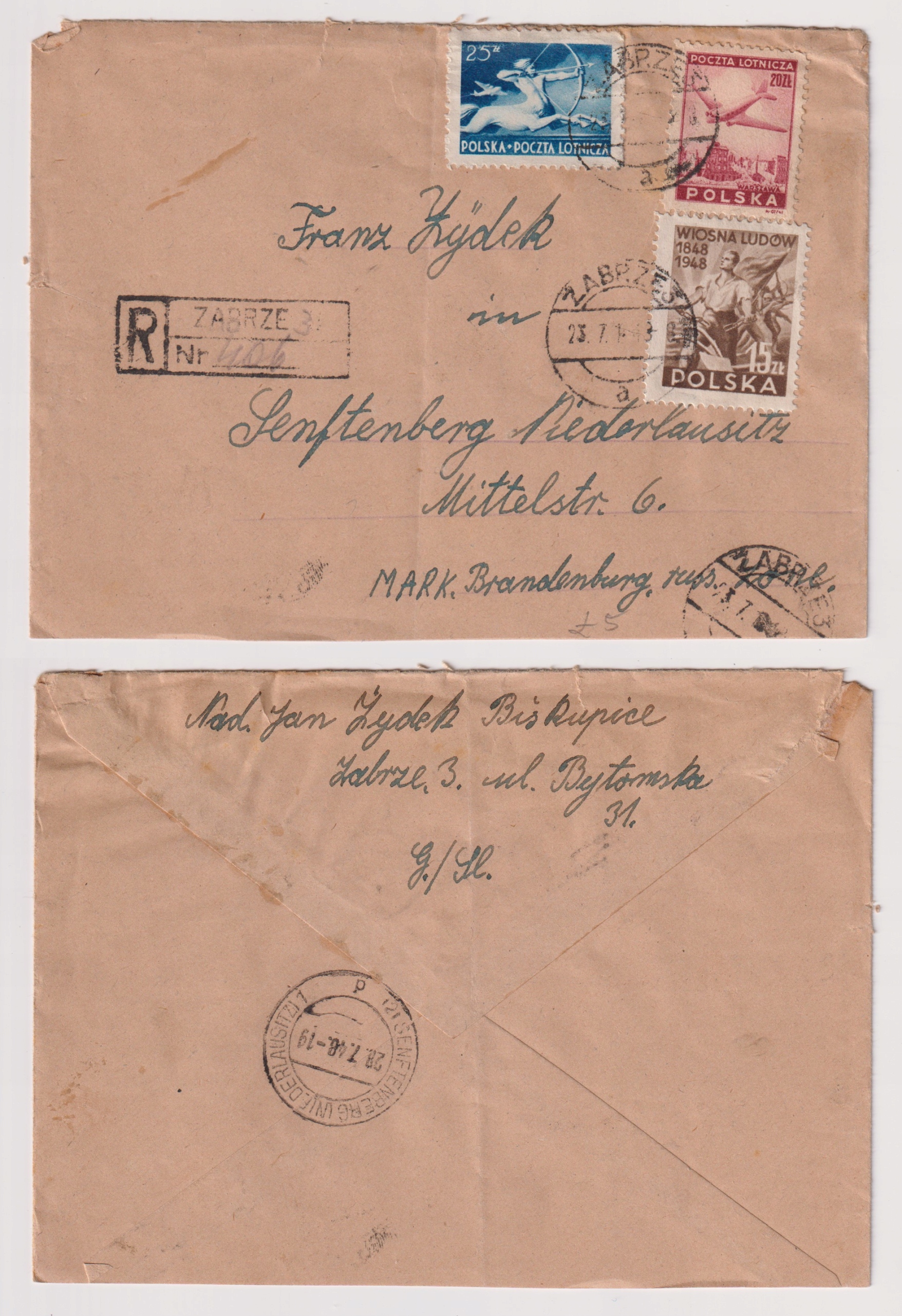 Заказное письмо 1948 г. Забже - Зенфтенберг.
