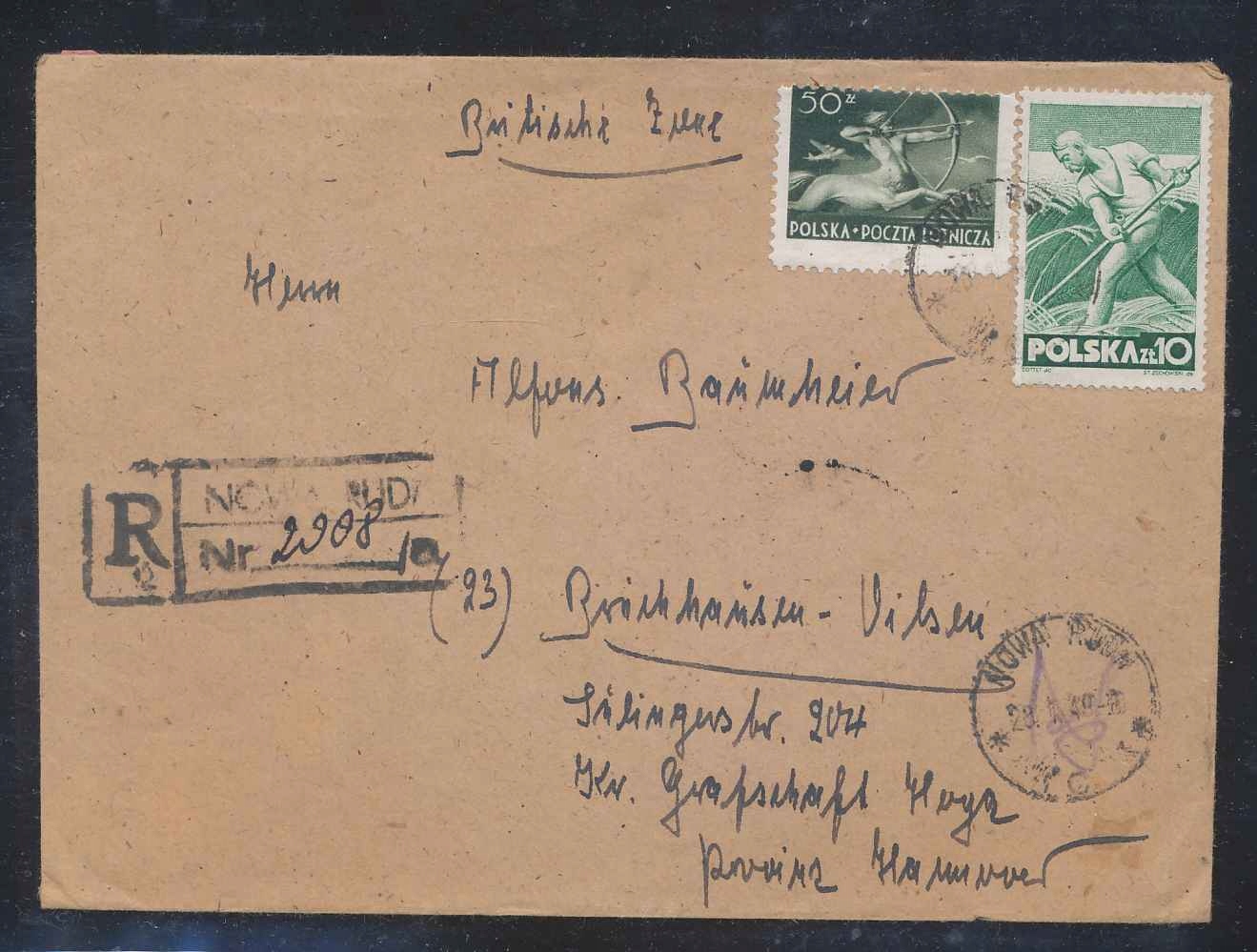 1949 г. Нижняя Силезия, импровизированная, высокая инфляция, зарегистрированная конверт R-Now Ruda, Истотерская марка, интересный смешанный франк. PLN 60. Стоимость доставки PLN 10. Приоритетное зарегистрированное письмо. Регионалия, небольшая родина - Нова Руда, Нижняя Силезия. h1>