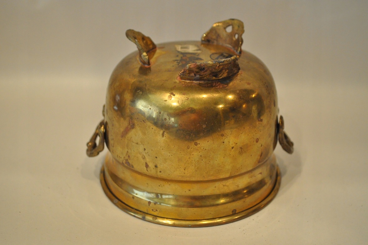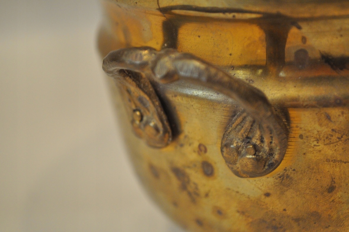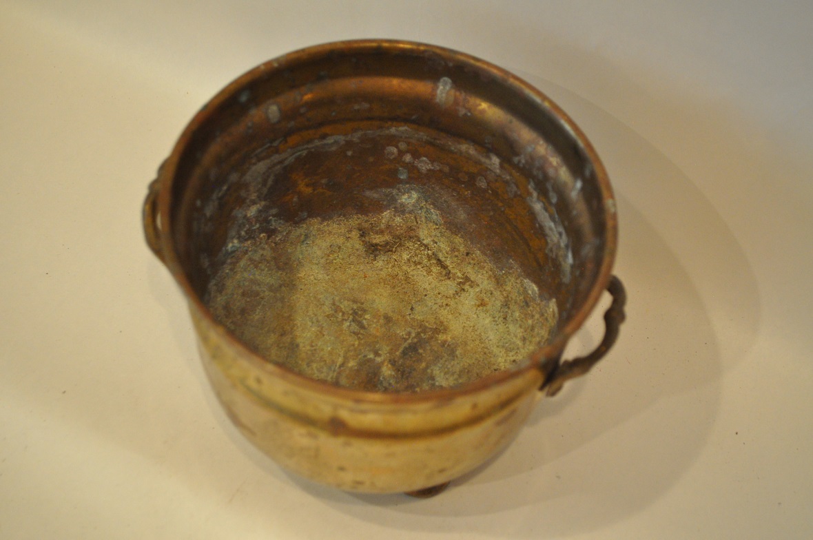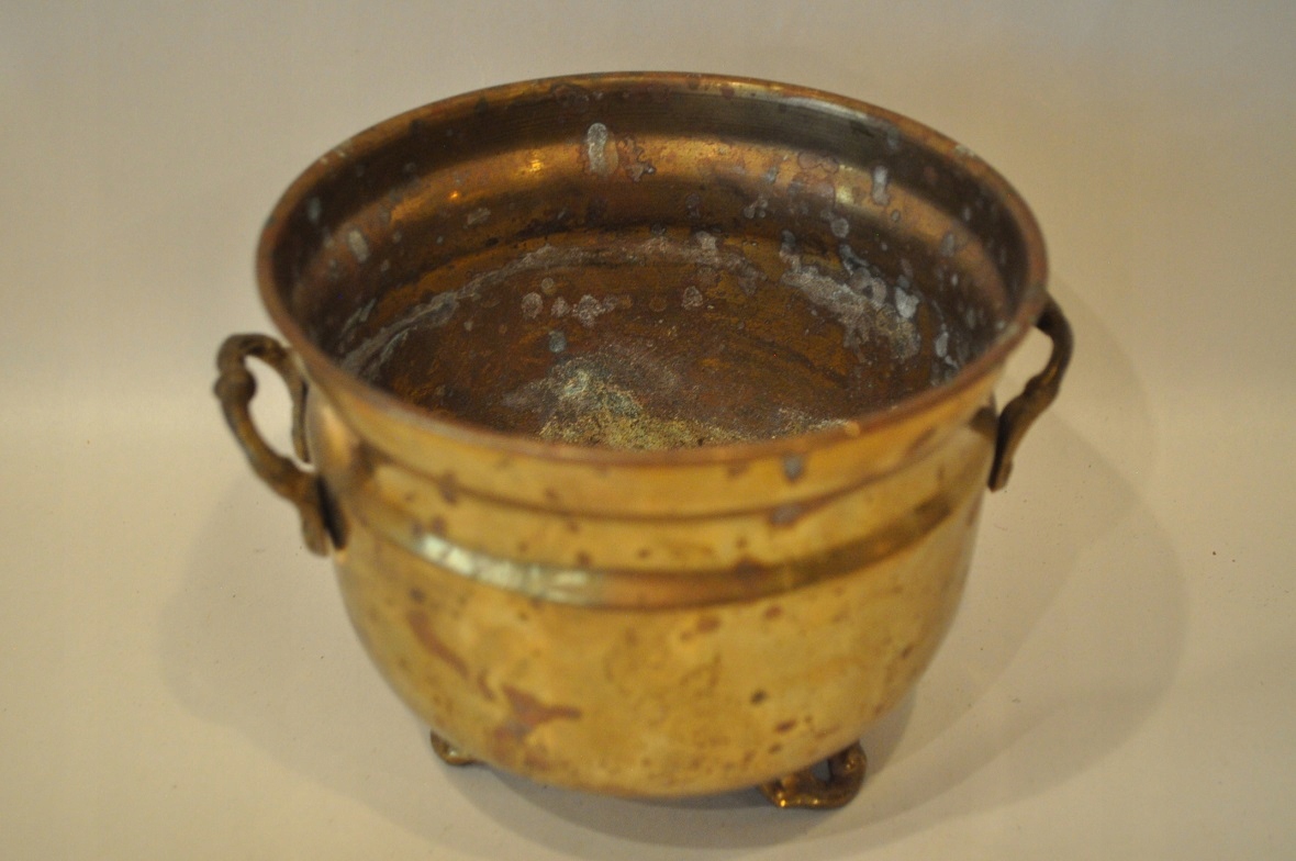 Кастрюля не чистилась - латунь покрыта старым налетом и потертостями.