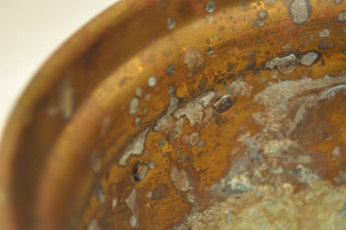 Кастрюля не чистилась - латунь покрыта старым покрытием и пятна.