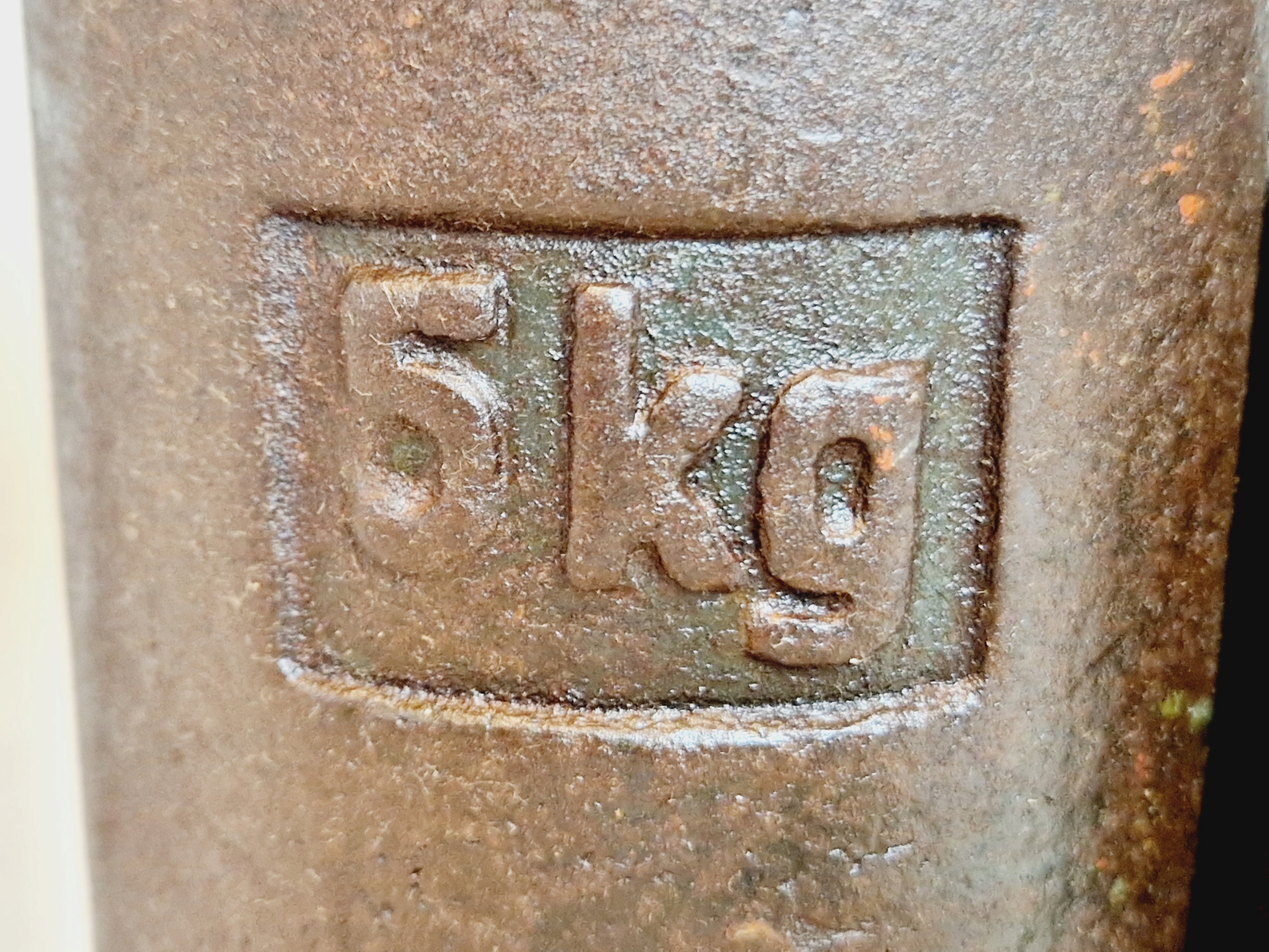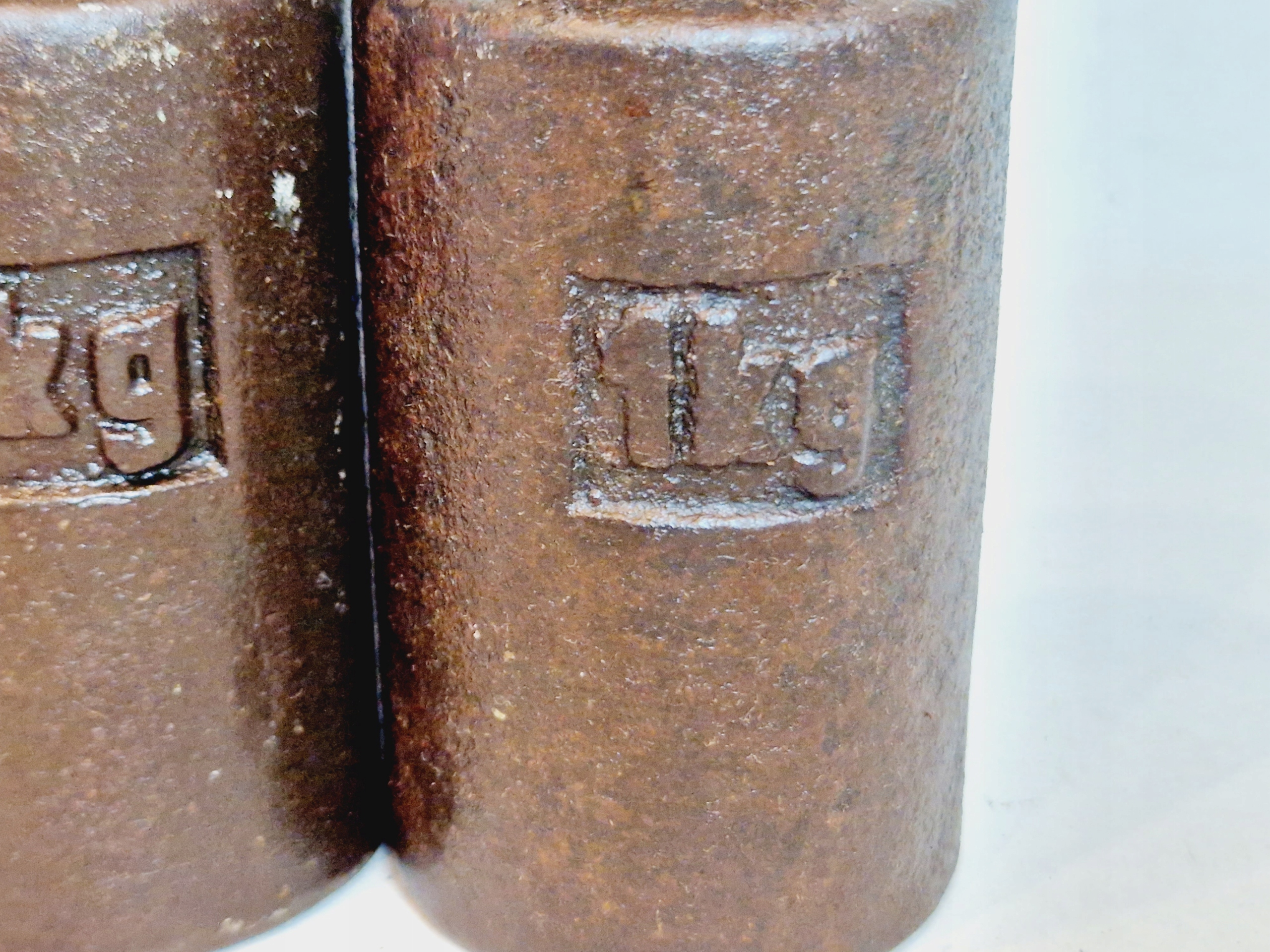 Минимальные повреждения краев основания гирь. одна из 1-килограммовых гирь – визуальной значимости нет.