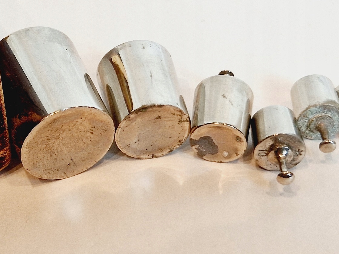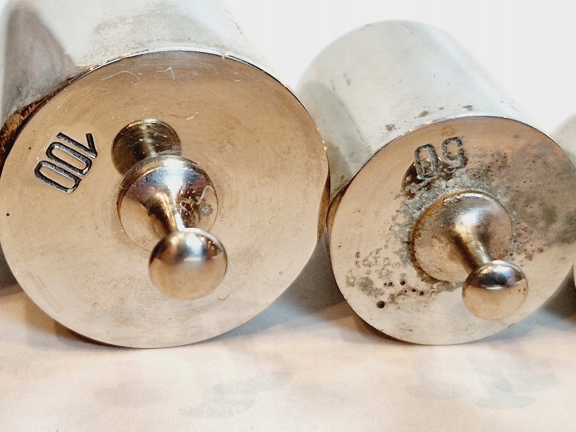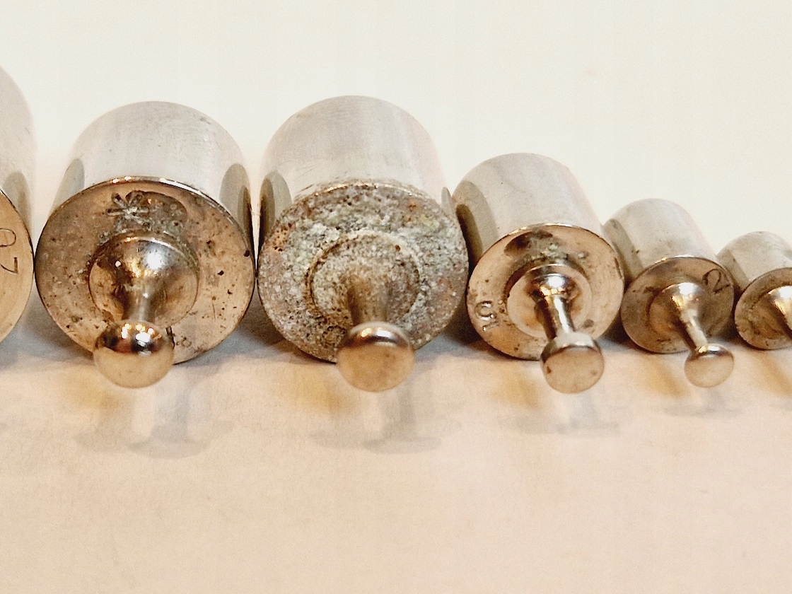 Один из 10- Граммовые гири имеют интенсивное красновато-коричневое покрытие на воротнике.