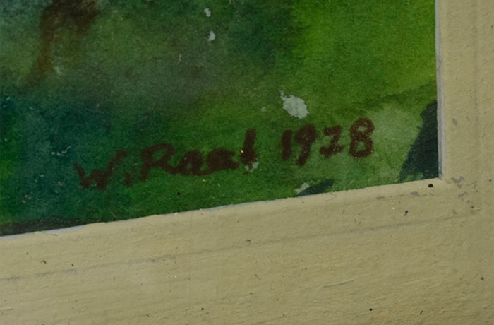 Две старинные картины - акварели, в рамах за стеклом, изображающие сельские пейзажи. Картины подписаны «В. РААБ». Один из них датирован «1978 годом».