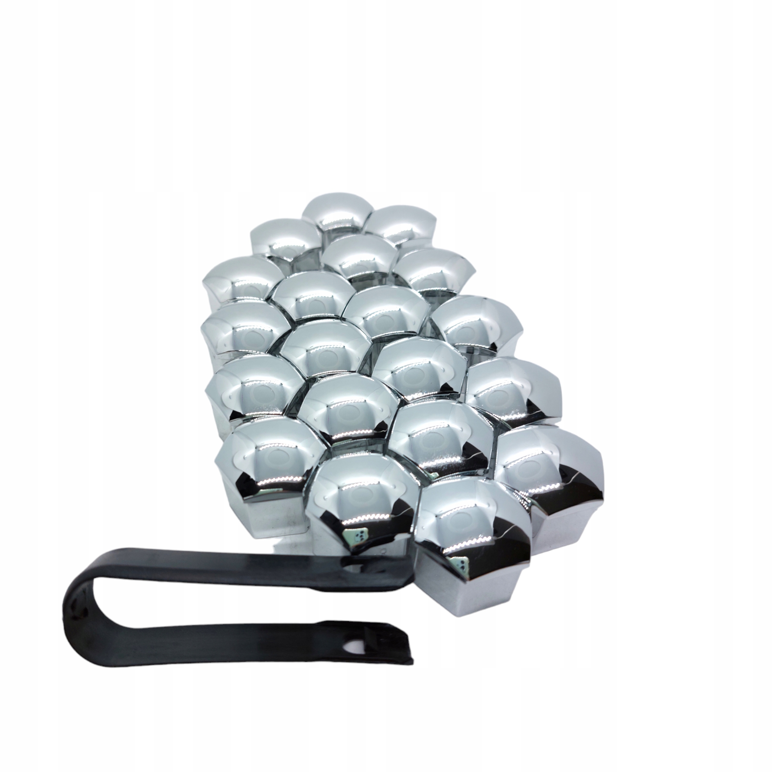 В комплект входят 20 штук серебряных (хромированных) накладок на болты крепления колес автомобиля и гайки.В комплект также входят плоскогубцы для снятия накладок. Крышки универсальны, подходят ко всем винтам и гайкам с размером ключа 19мм.