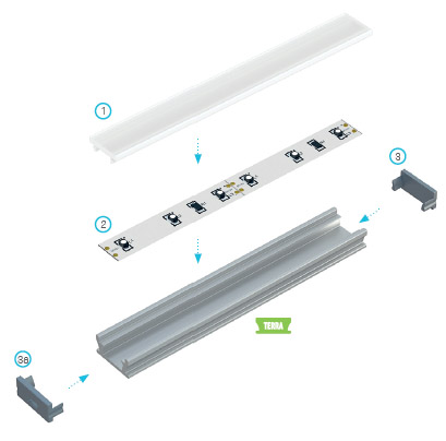 Схема сборки элементов системы освещения с использованием профиля ТЕРРА и (1) торшера, (2) светодиодной ленты, (3) цоколя без отверстия, (3а) цоколя с отверстием