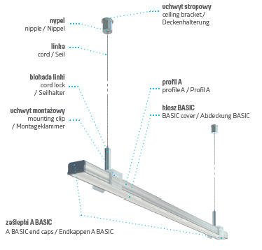 Схема сборки элементов системы освещения с использованием профиля А и (1) абажура BASIC, (2) светодиодной ленты, (3) цоколя с отверстием, (3а) цоколя без отверстия, (4) крепежного винта, (5) монтажный кронштейн И MINI