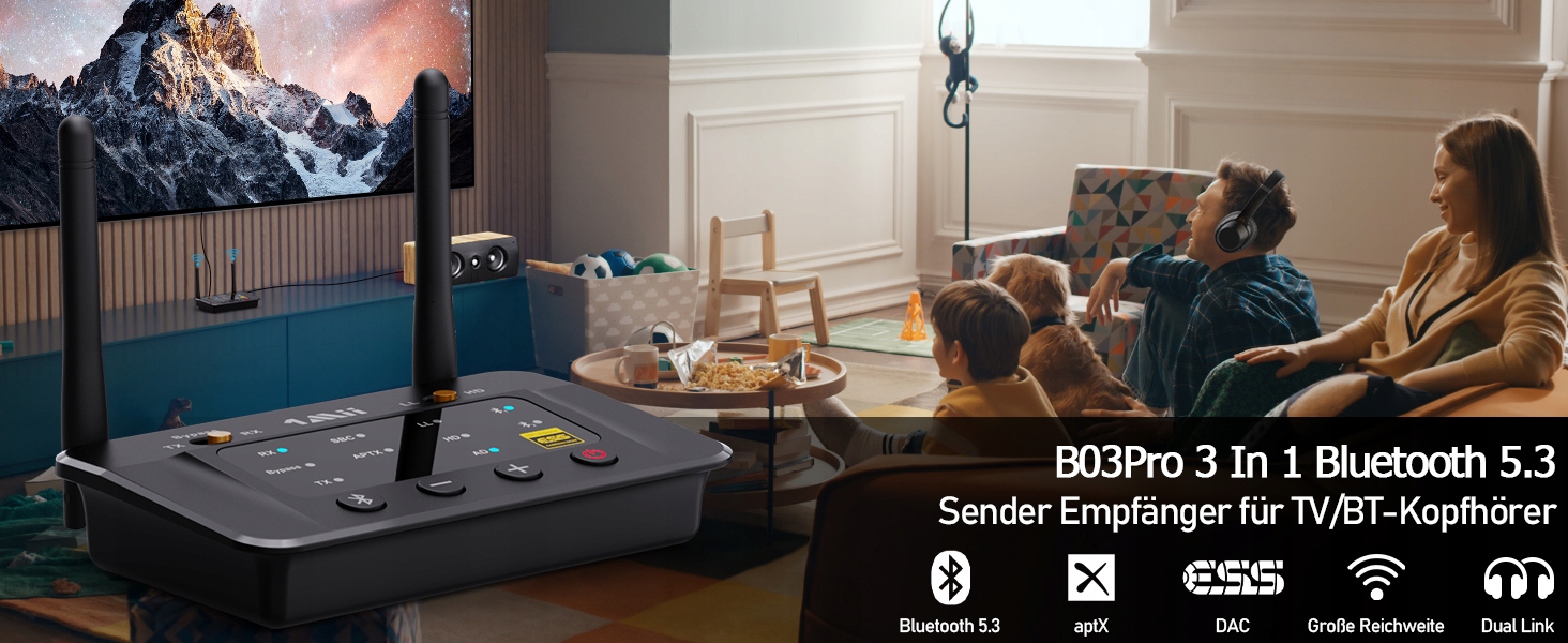 1Mii B03Pro Bluetooth 5.3 передатчик-приемник-передатчик для телевизора, HiFi, беспроводной аудиоадаптер с ЦАП и AptX HD с низкой задержкой для наушников, домашней стереосистемы, цифровой оптический, AUX, RCA