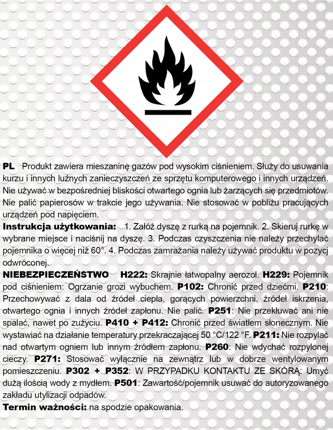 Продукт представляет собой смесь газов высокого давления. Используется для удаления пыли и других рыхлых загрязнений с компьютерной техники, электроники, бытовой техники и других устройств. Не встряхивайте контейнер непосредственно перед использованием.
